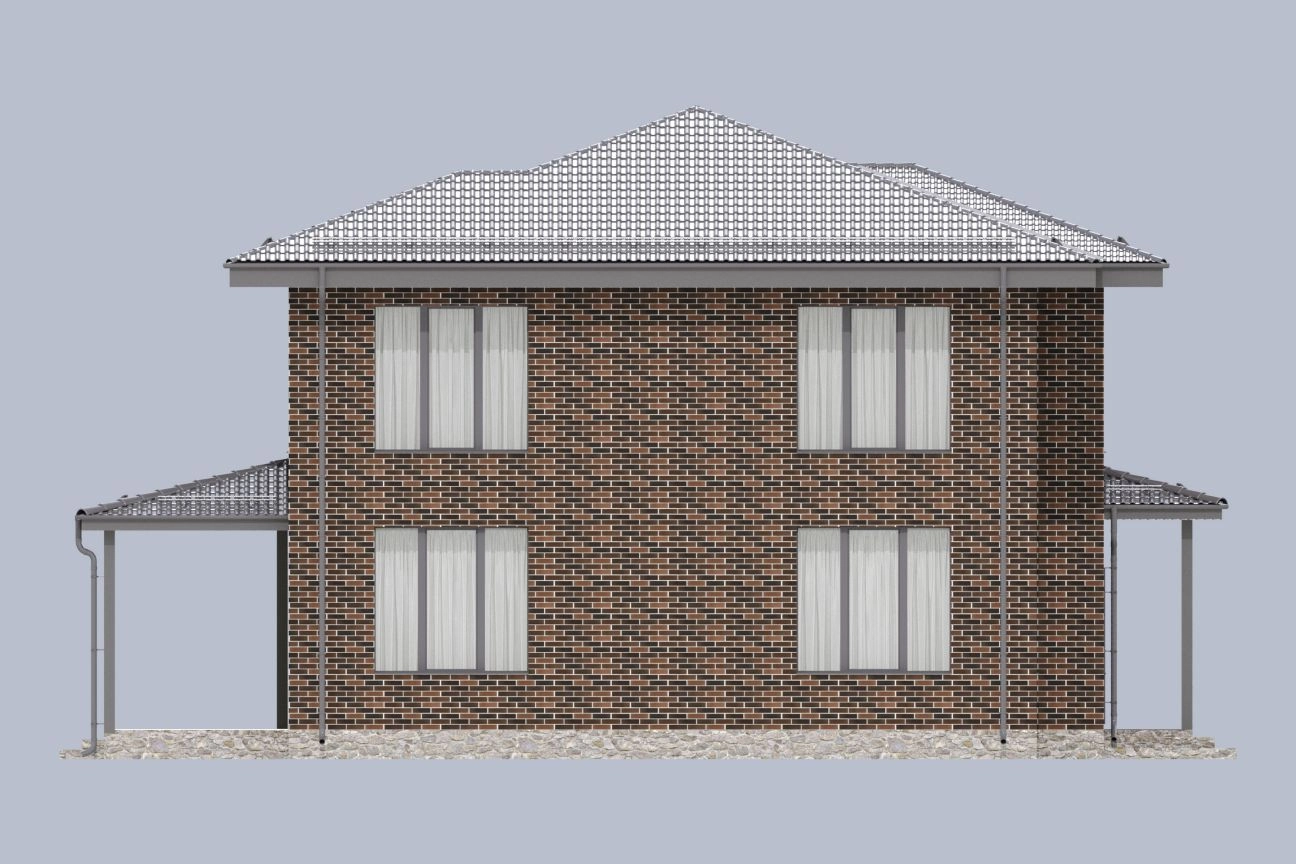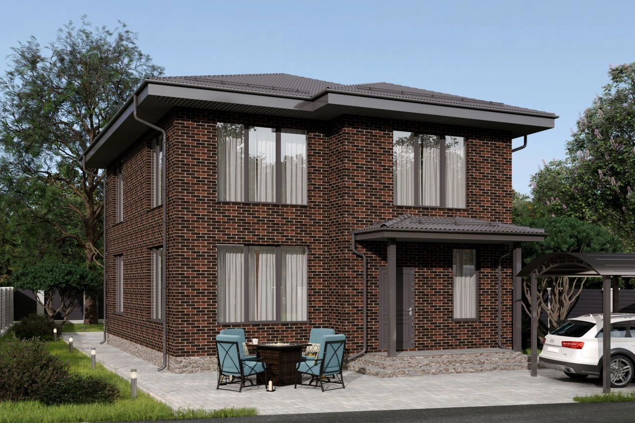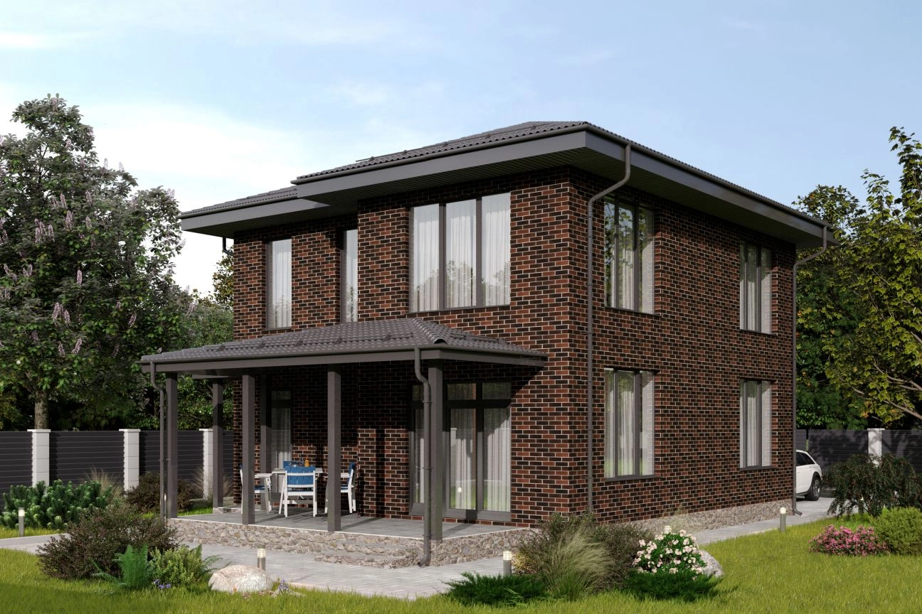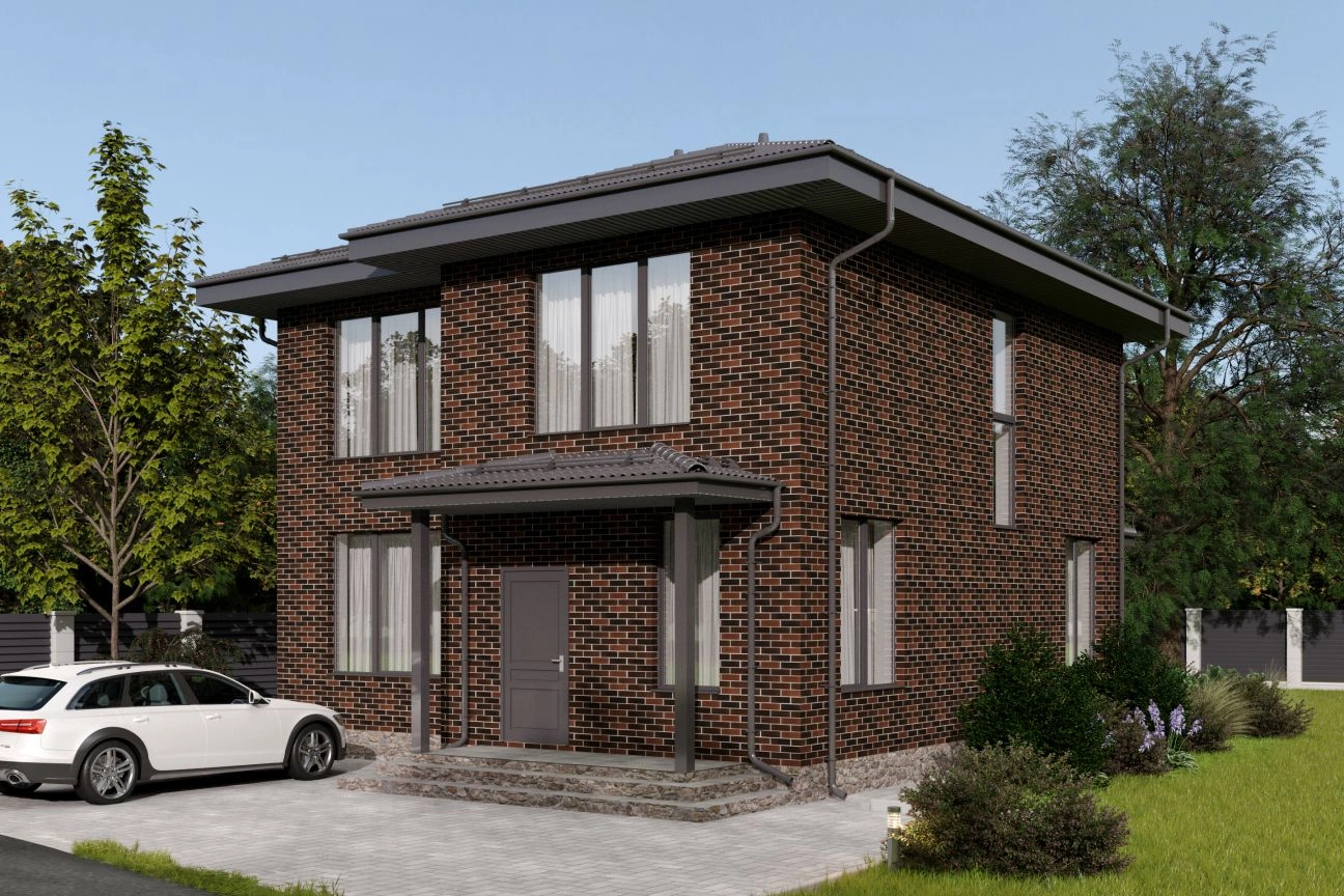 Фасад выполнен из кирпича типа «флеш». Панорамные окна подчеркивают особую индивидуальность дома, создают ощущение простора и легкости внутреннего пространства.