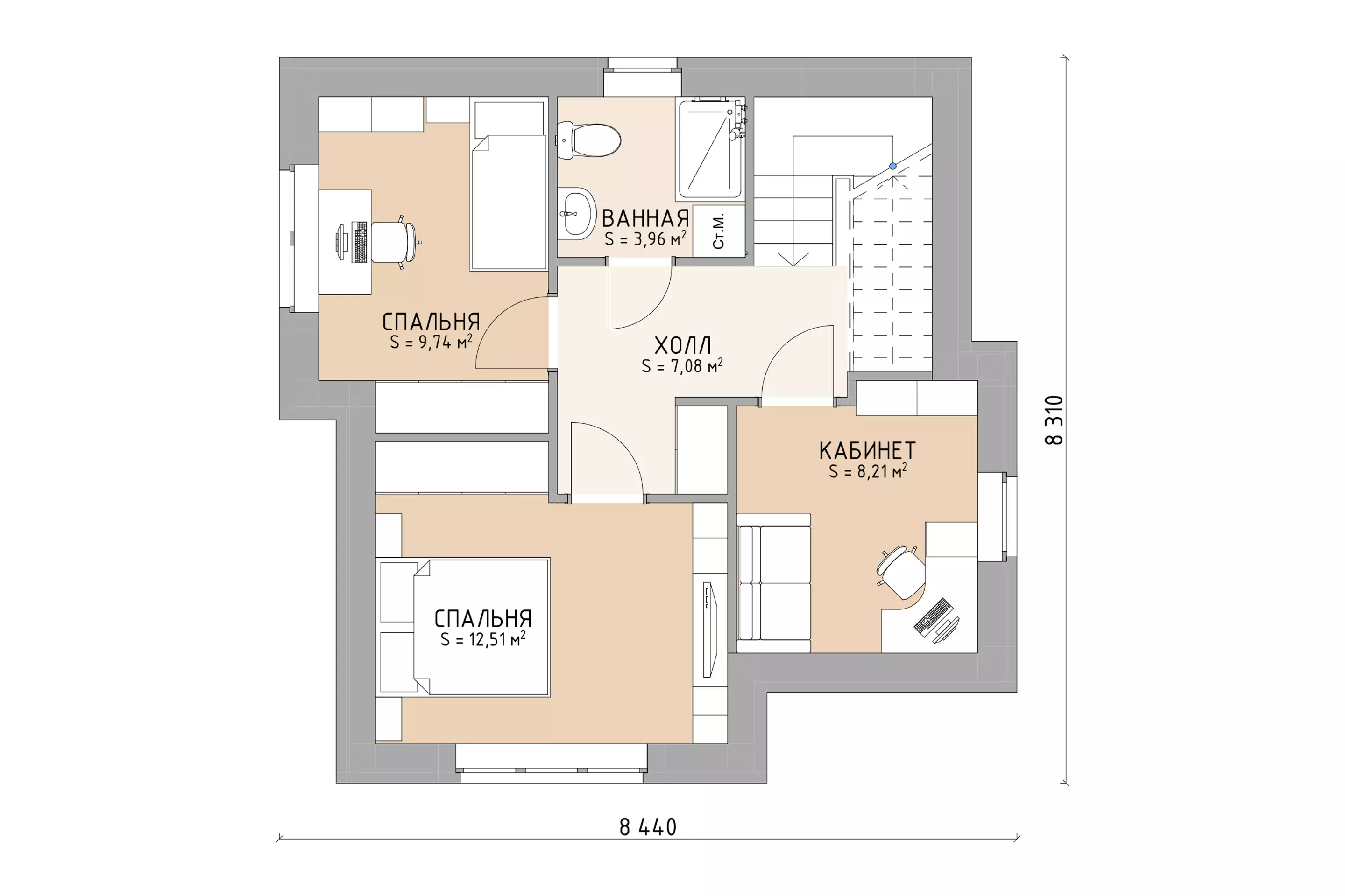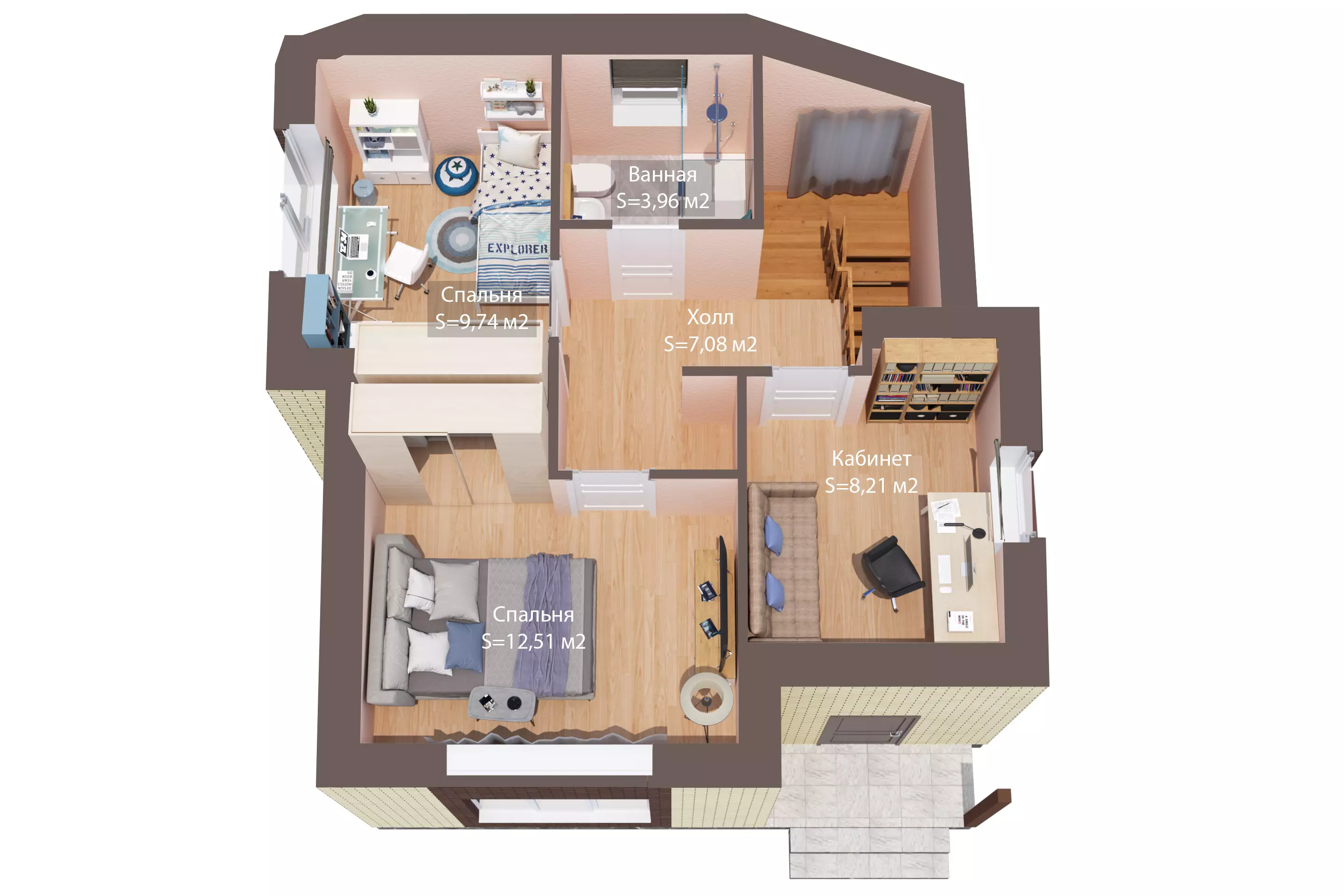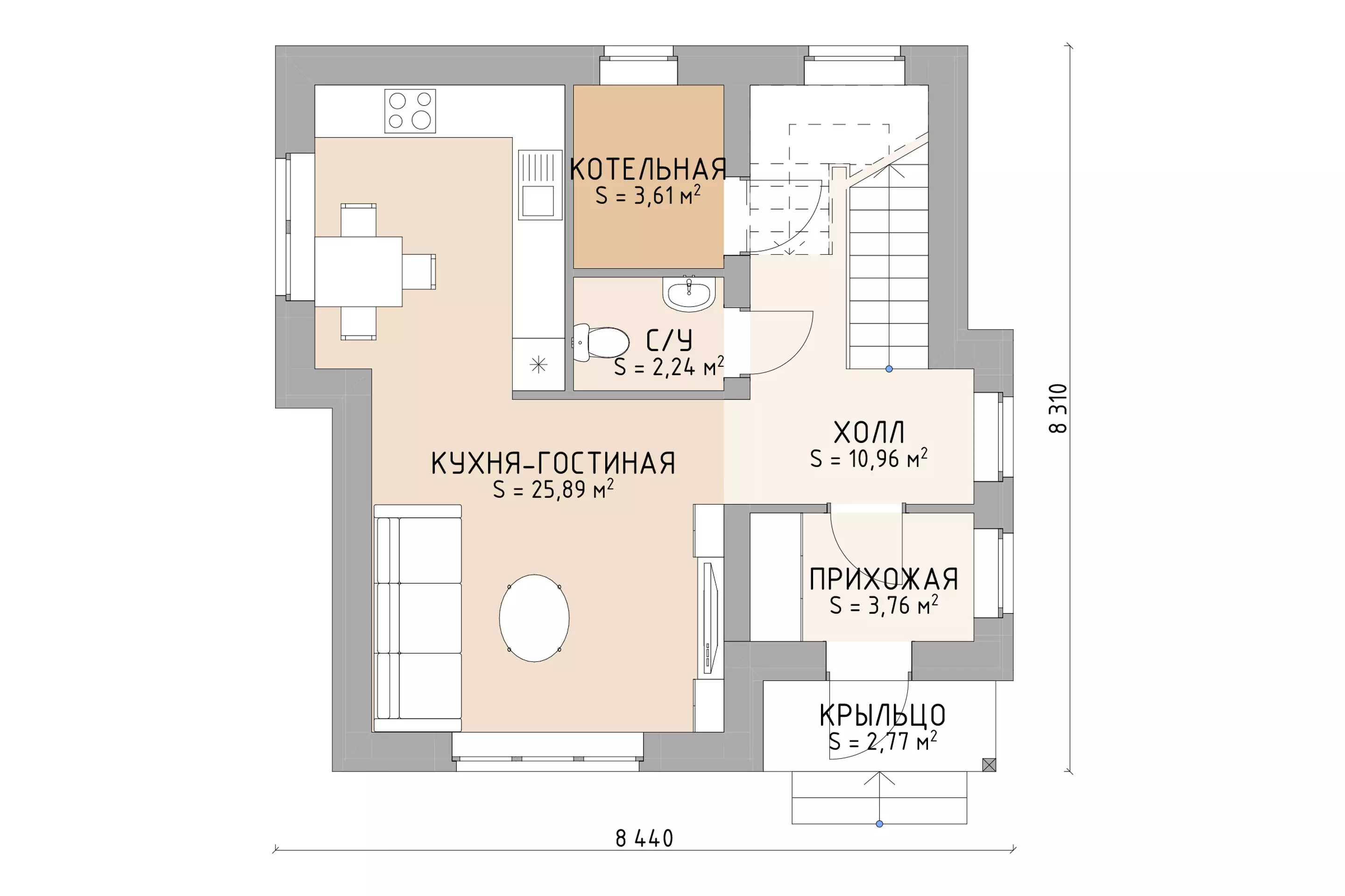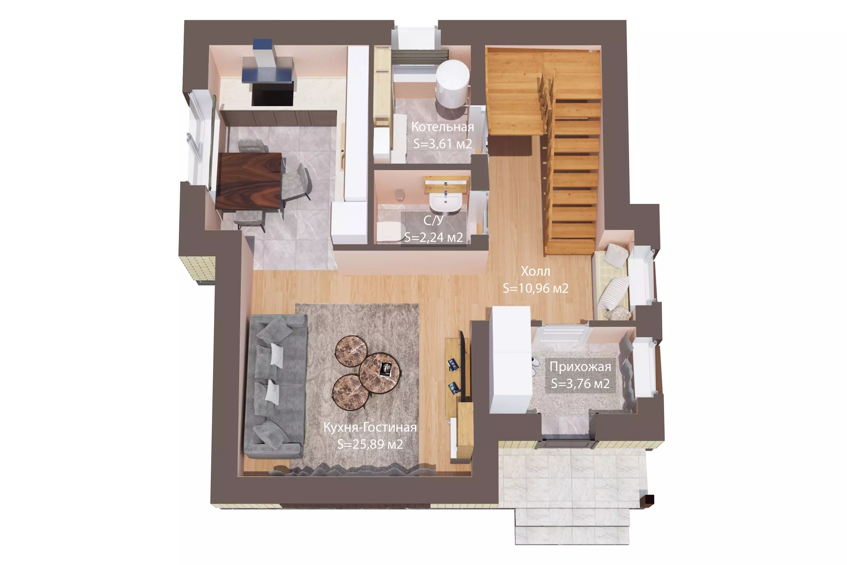 "Марио 100" - уменьшенная копия нашего знаменитого проекта "Марио". Компактный дом вмещает в себя кухню-гостиную, площадью 25 м2, 2 санузла, 2 спальни, а так же кабинет.
