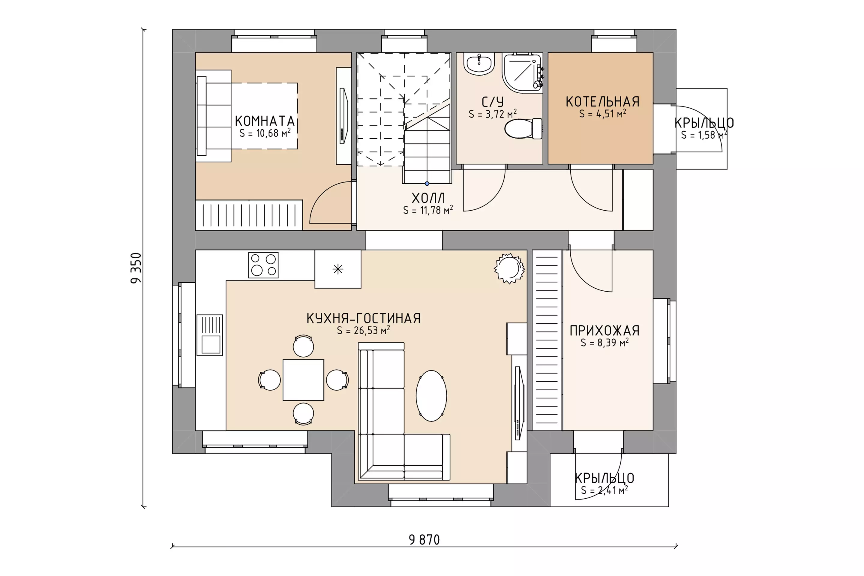 Внутренние несущие стены из газобетона 625*250*250 D400 и/или 625*250*300 D300 - Крыльцо с бетонными ступенями и навесом