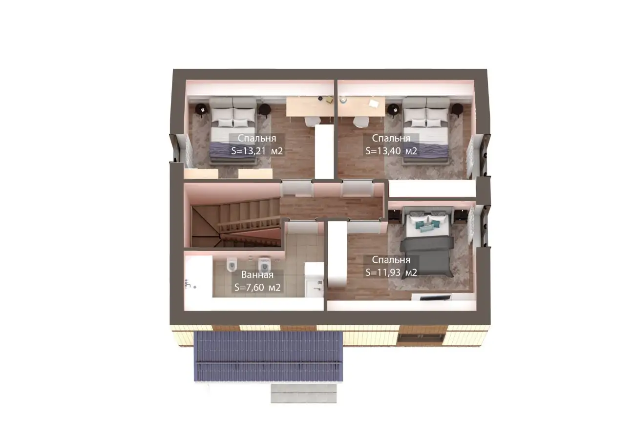 На первом этаже расположилась просторная кухня-гостиная, гостевая комната, технические помещения и санузел. На мансардном этаже вместились три спальни и ванная комната. При необходимости спальню можно переоборудовать в кабинет или игровую комнату.