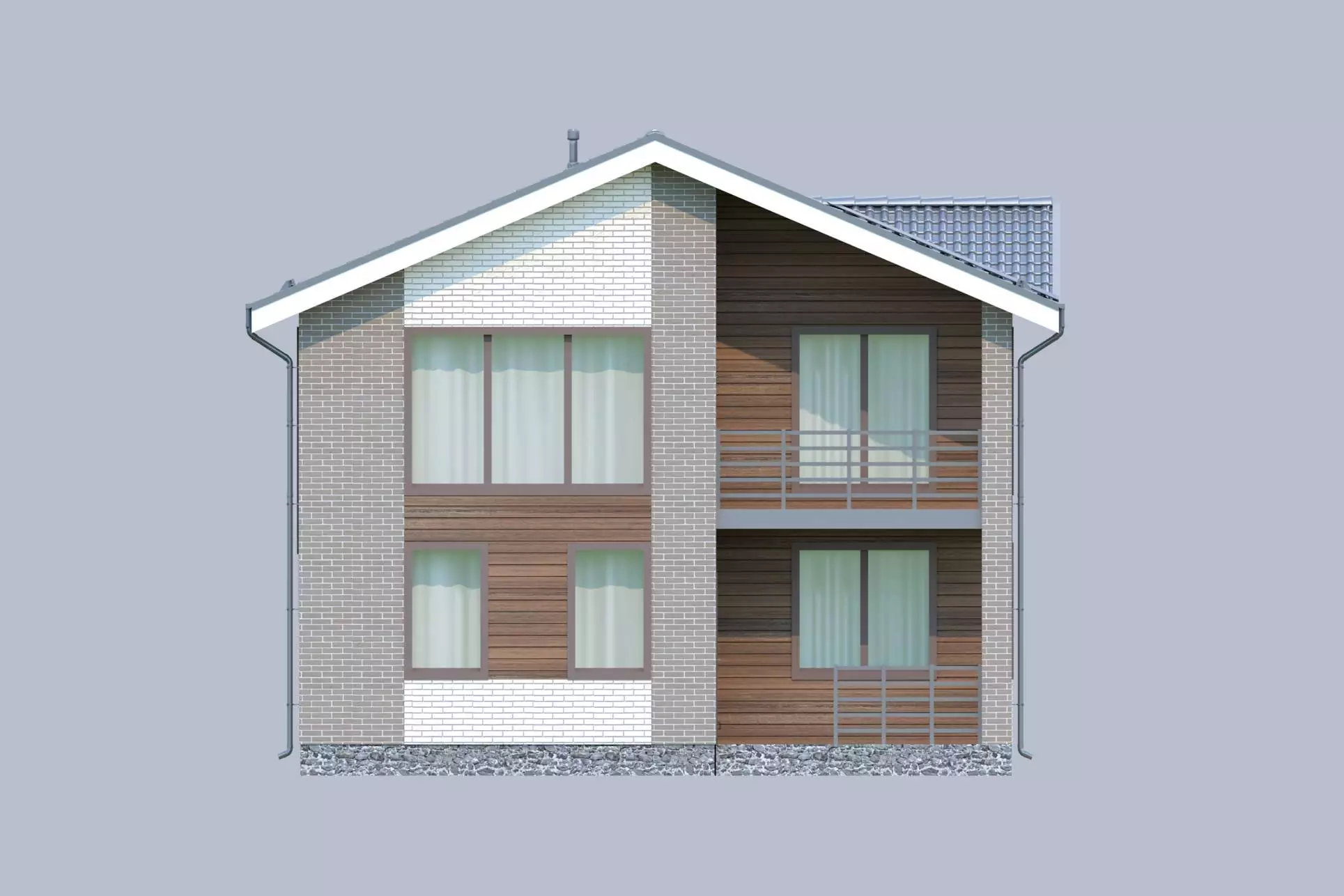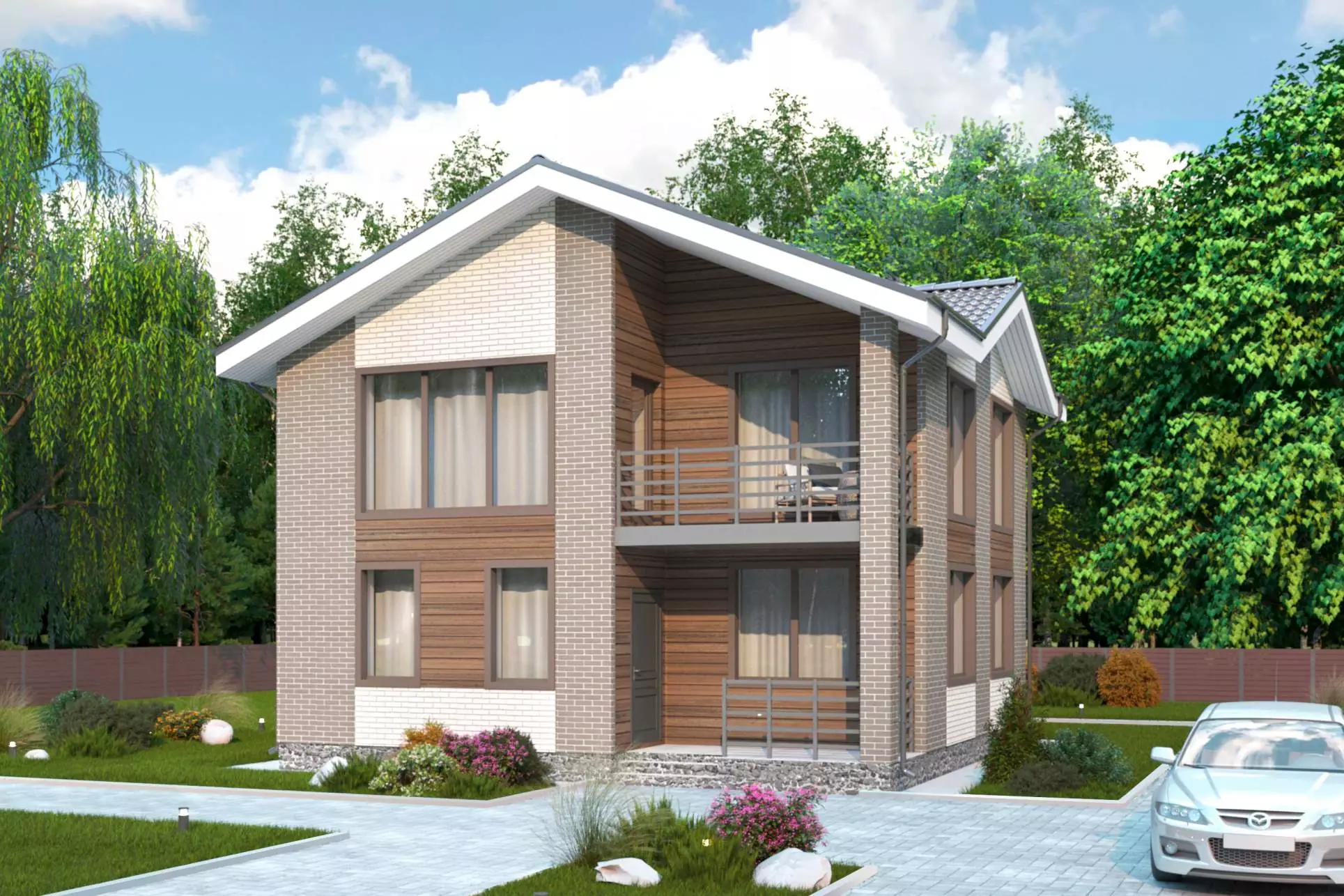 Особенностью экстерьера проекта «Ренато» является комбинирование разнофактурных отделочных материалов - облицовочного кирпича и планкена. Главный фасад здания украшает открытый балкон, который органично вписывается в общую композицию с крыльцом, создавая ощущение единого пространства.