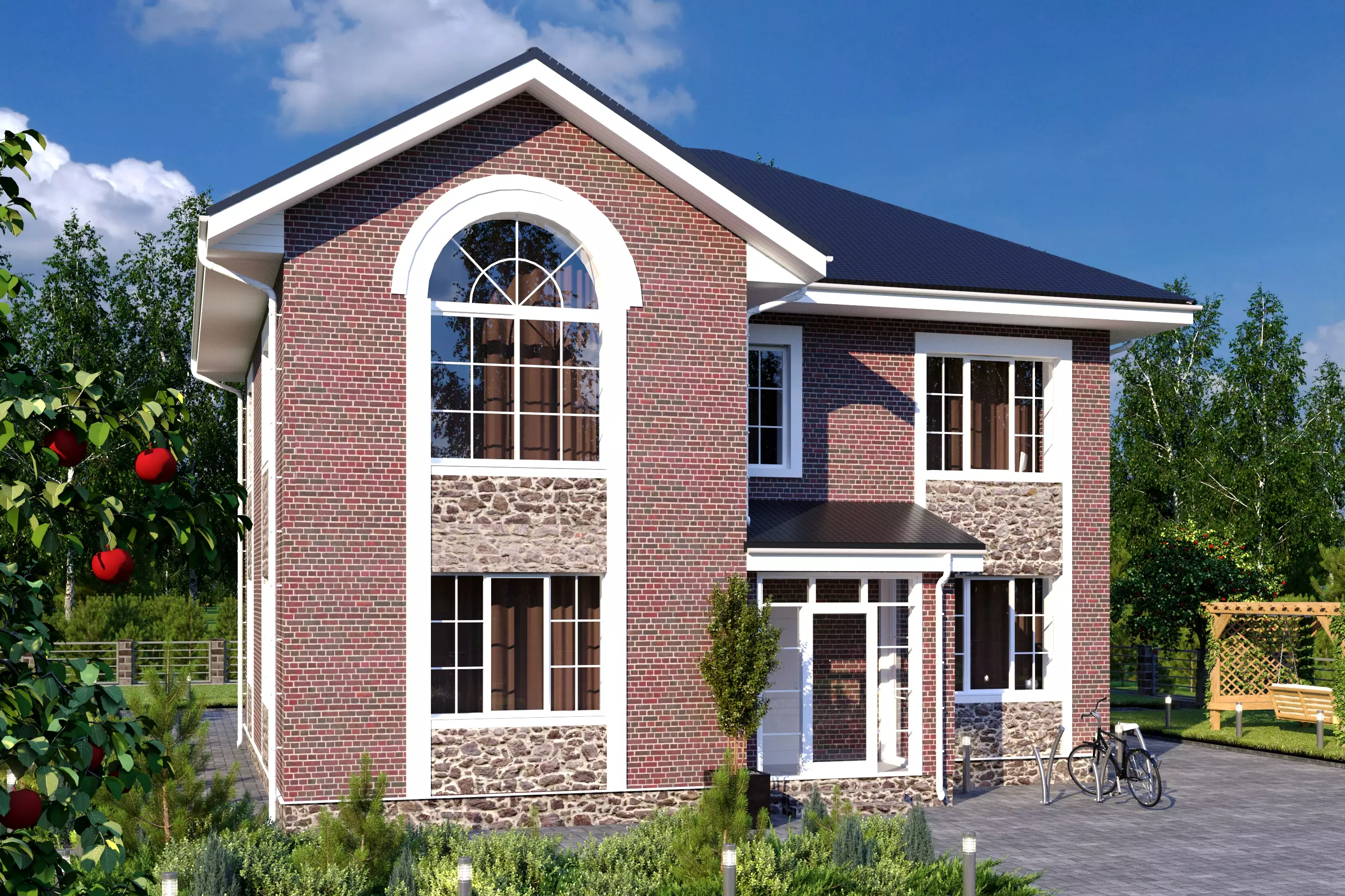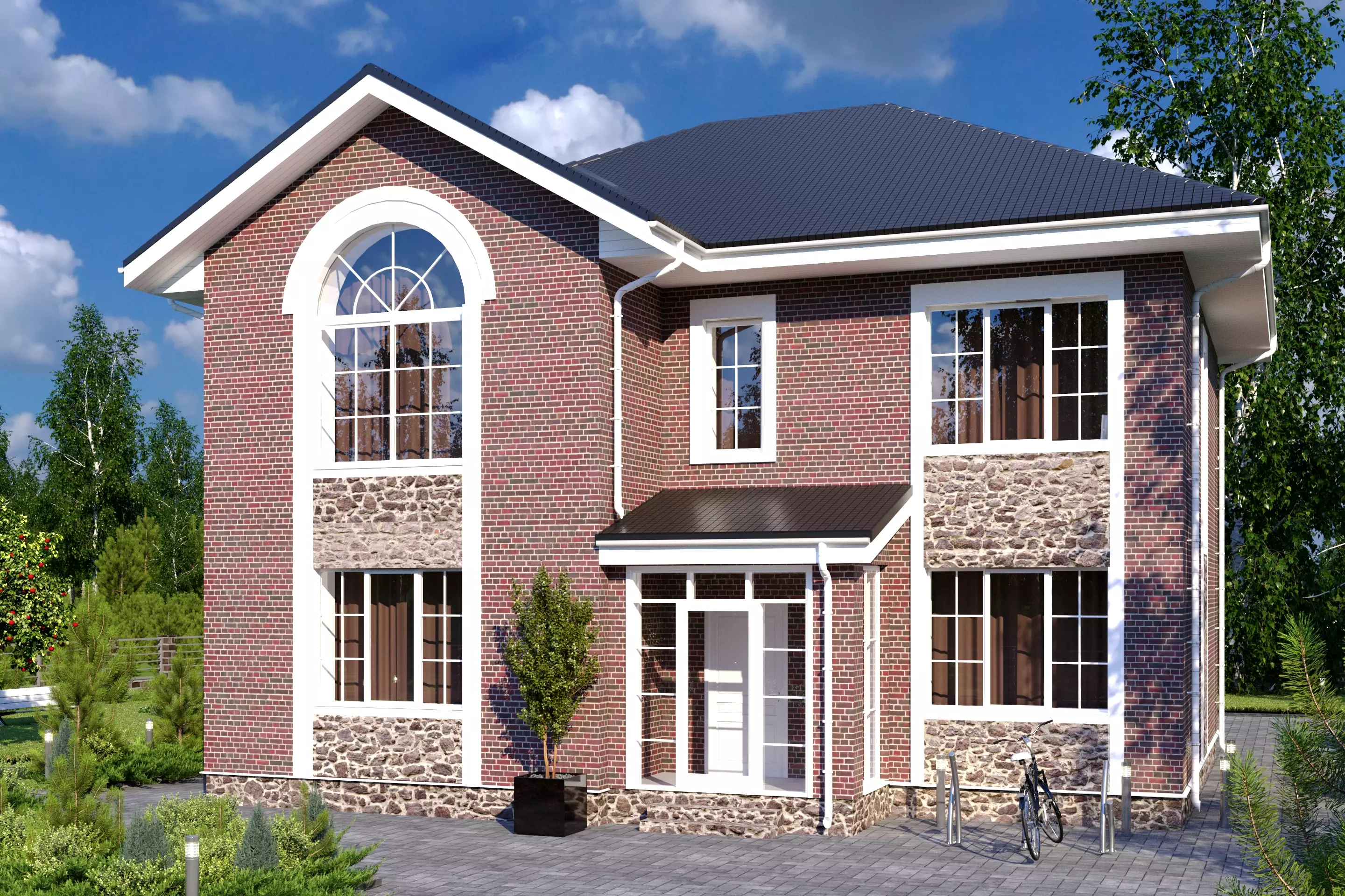 "Сантино" – большой двухэтажный дом, выполненный в классическом стиле. Выразительной чертой экстерьера стало сочетание декоративного камня и кирпича в облицовке дома. Интересные решения по остеклению добавляют внешнему виду «Сантино» особый шарм. Это шпросы на окнах, остекленное крыльцо и, конечно, брамантово окно главного фасада.