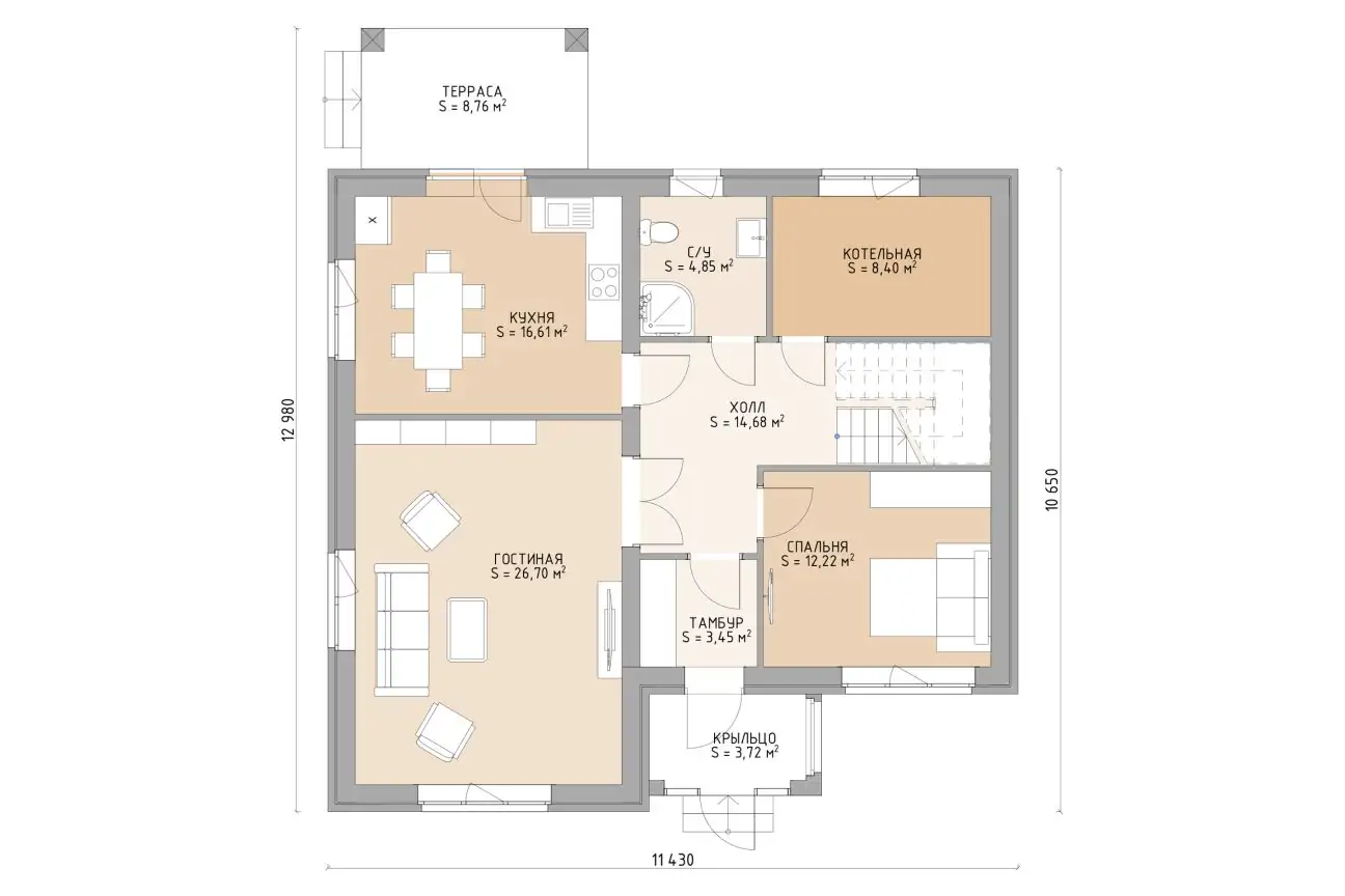 Идеальная планировка дома - это про «Сантино». На первом этаже расположилась вместительная гостиная, отдельная кухня с выходом на прекрасную террасу, широкий холл, а также комната для отдыха и технические помещения. Первый этаж станет центром притяжения домовладельцев и их гостей.