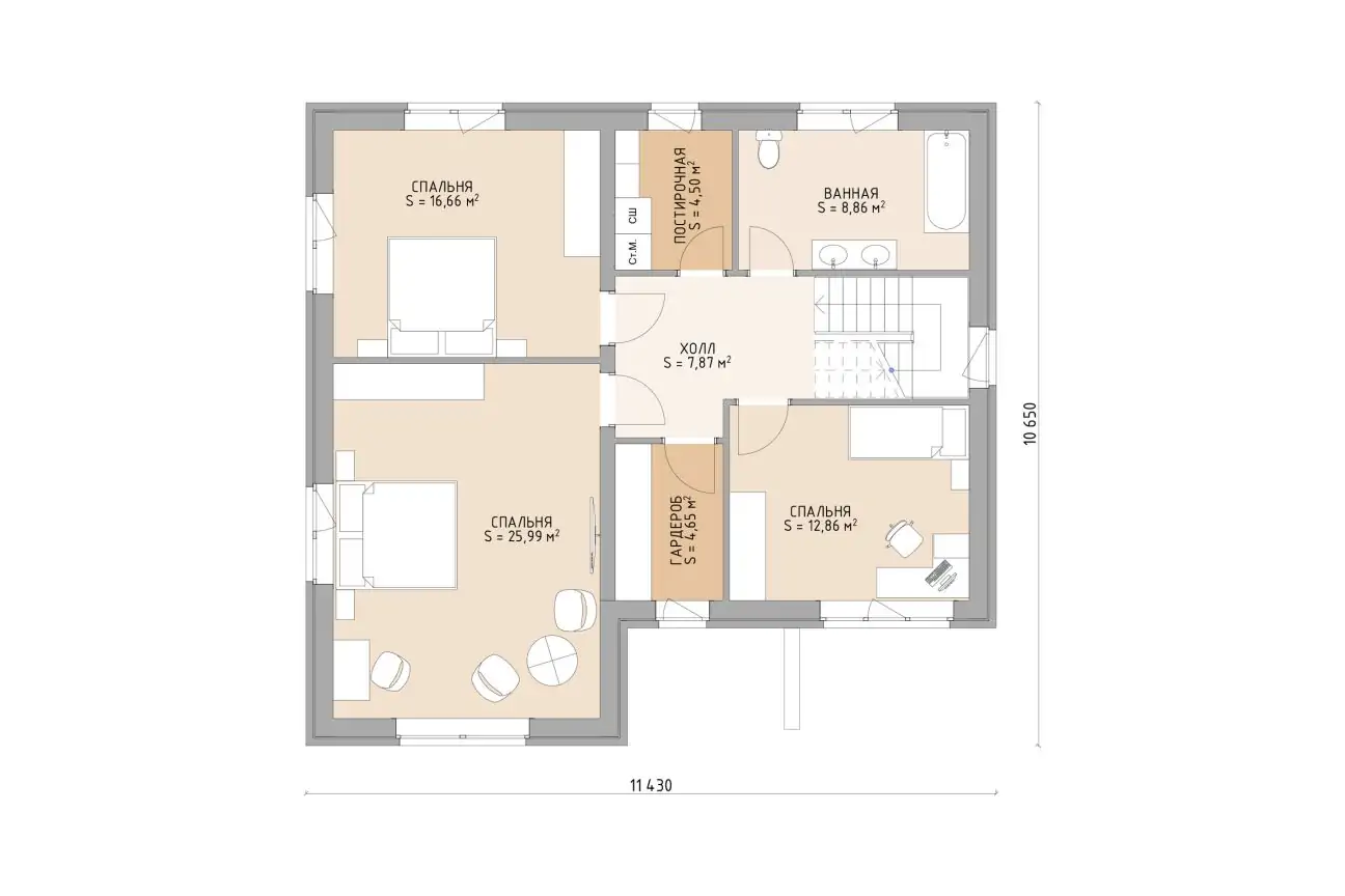 Второй этаж - место для отдыха и сна. Он вместил в себя три уютные спальни и просторную ванную комнату. Практичным хозяевам также понравится наличие постирочной и гардеробной.
