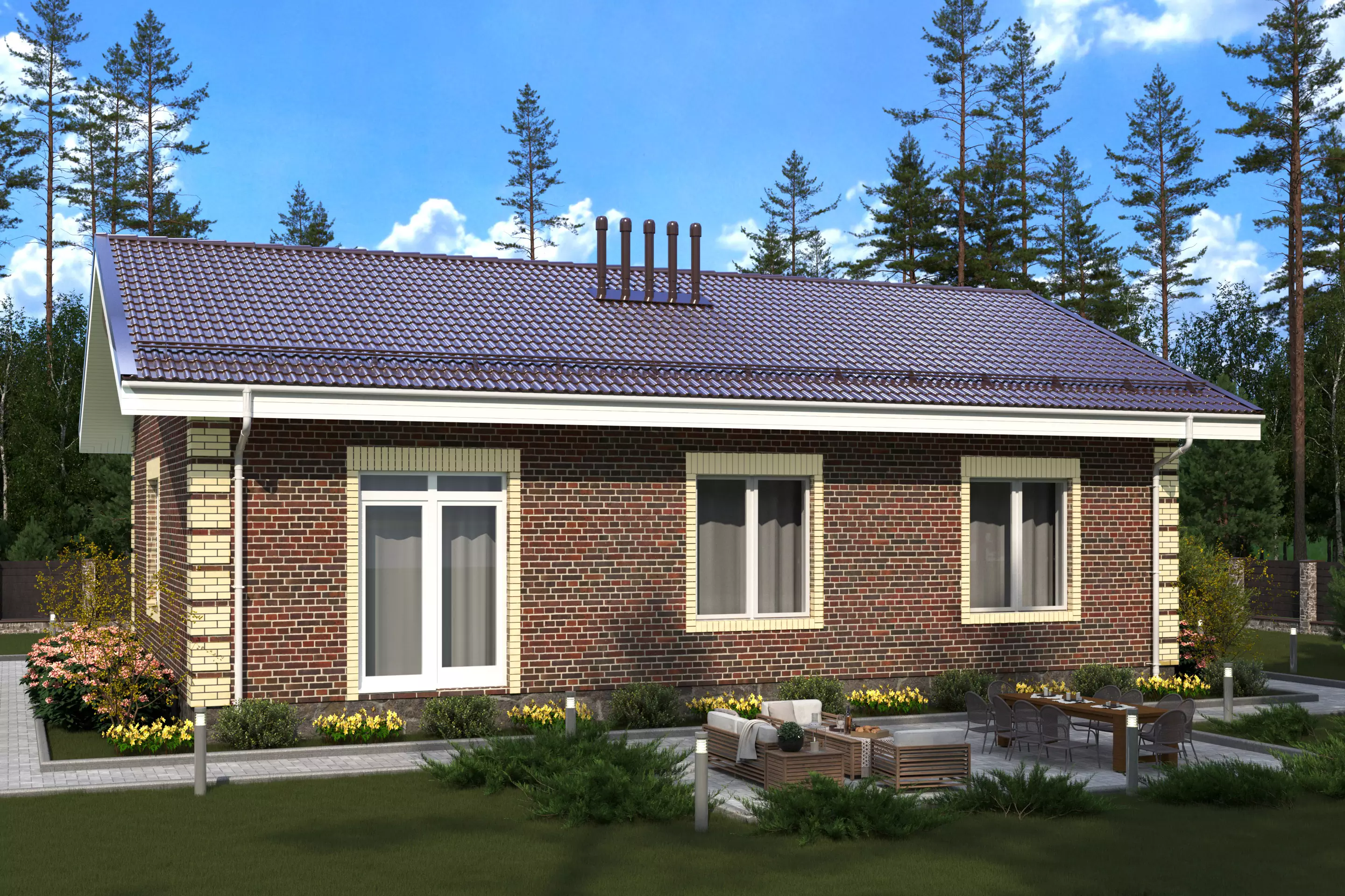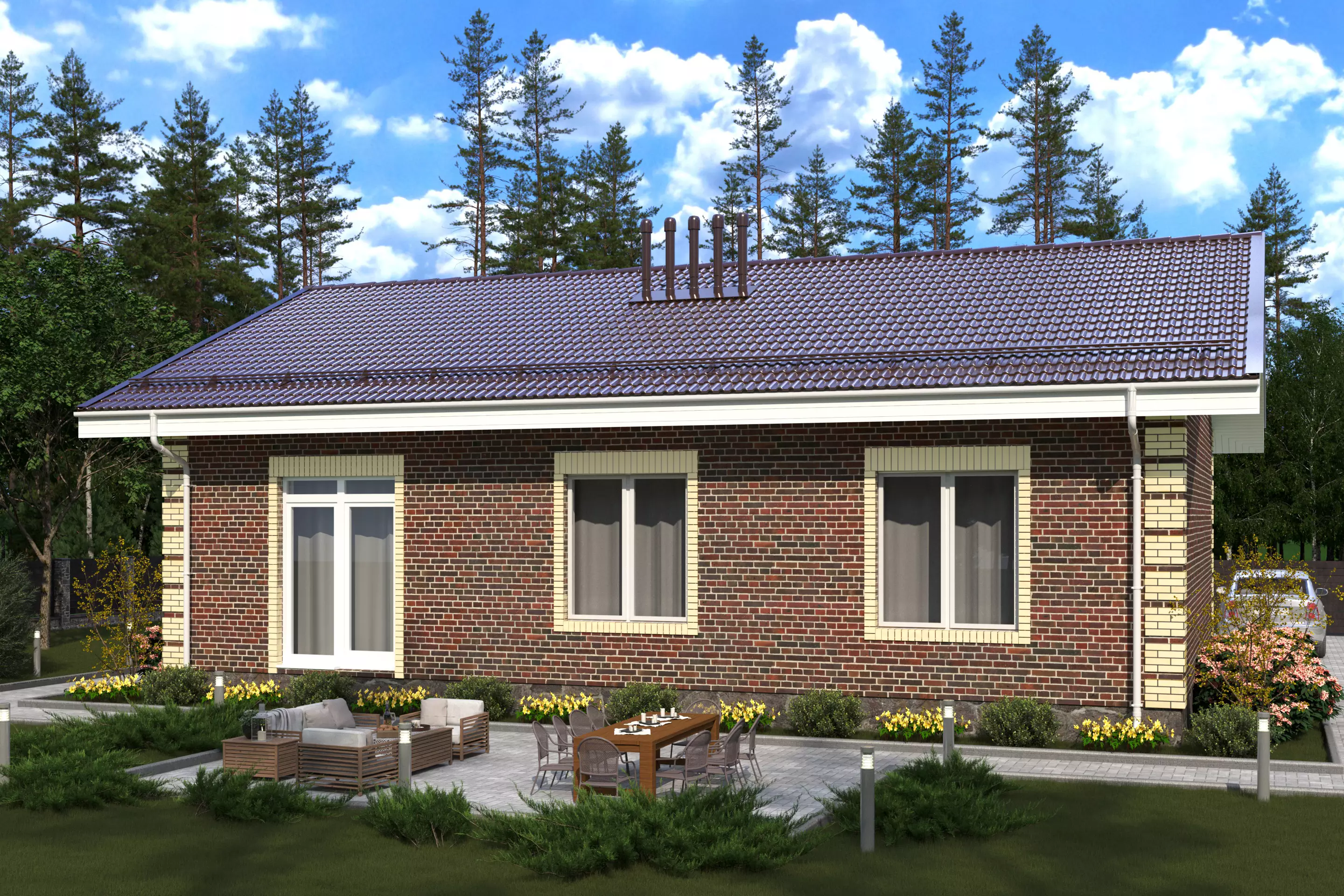Центром притяжения служит просторная кухня-гостиная площадью 32 м², из которой предусмотрен выход во внутренний дворик. В доме расположены три спальни, санузел, котельная и вместительный холл, объединяющий все внутренние помещения.