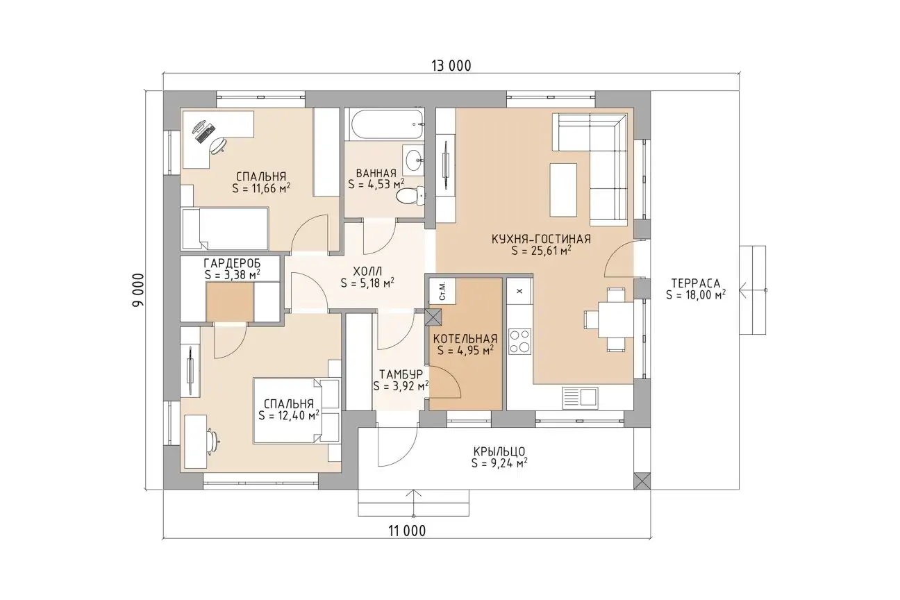 В доме также имеются две уютные спальные комнаты для отдыха всех членов семьи. Оставшееся пространство делят между собой помещения бытового характера: санузел, тамбур и котельная.
