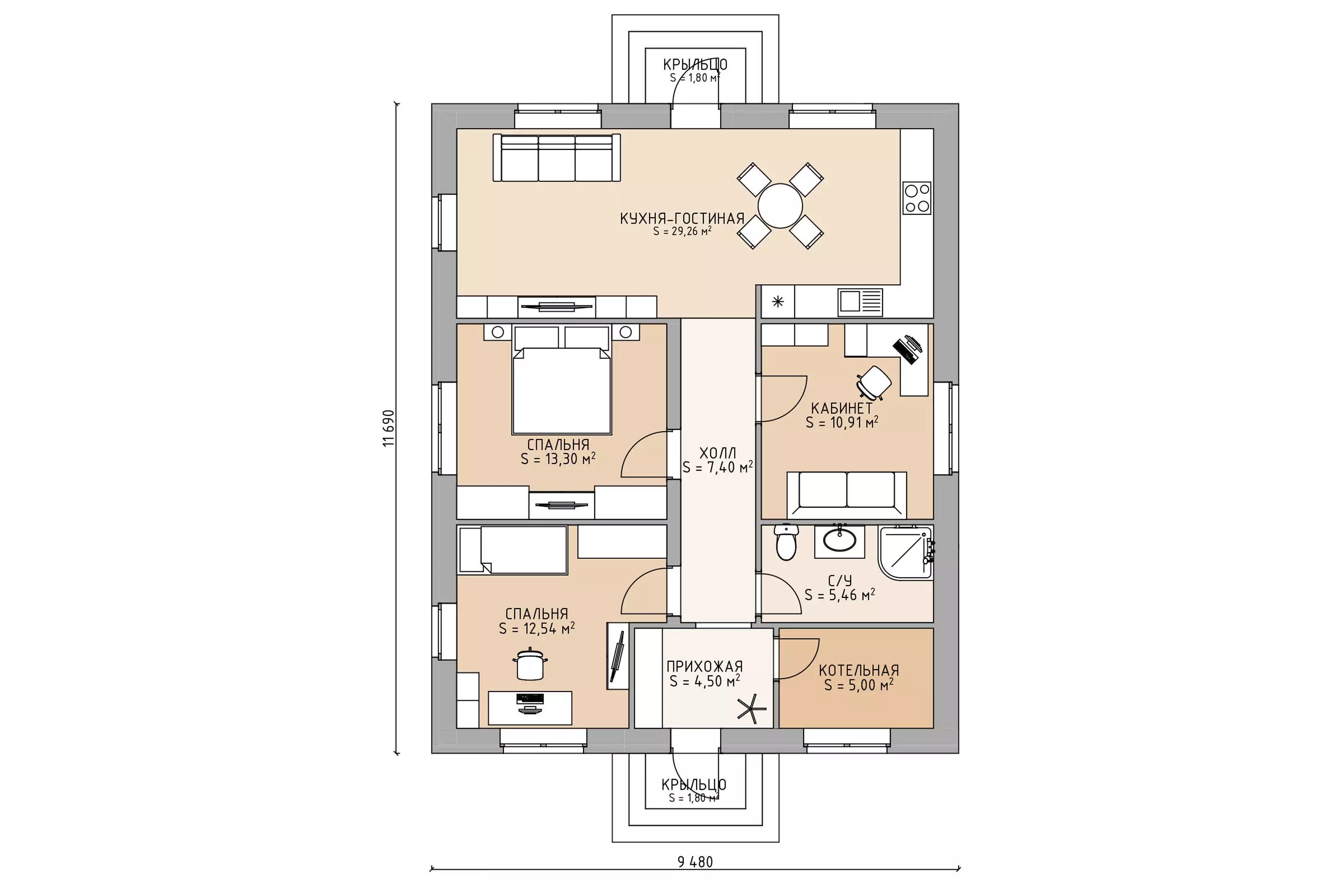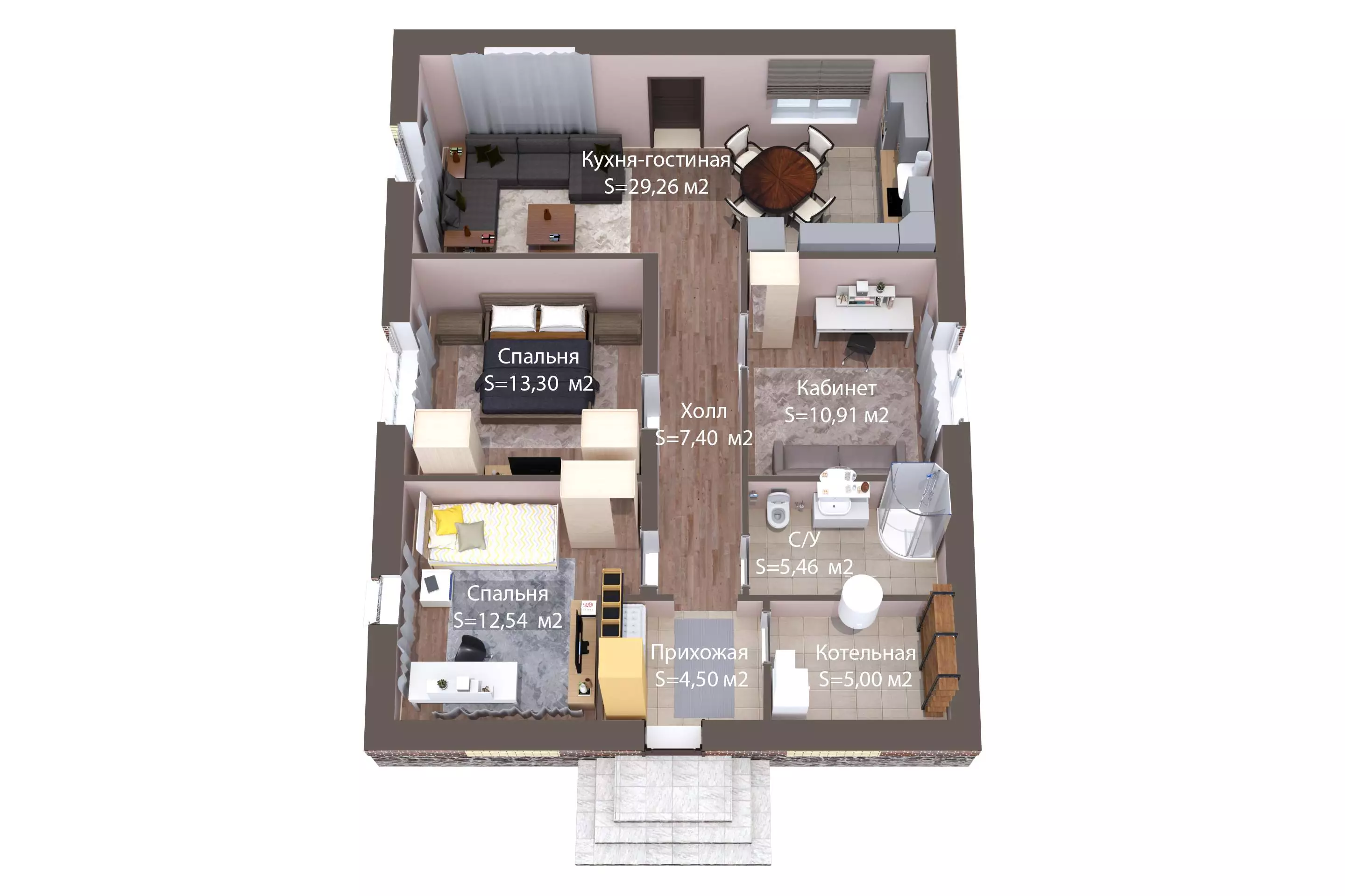 В доме предусмотрены три жилые комнаты, кухня-гостиная и технические помещения. Одна из комнат может быть переоборудована под кабинет, предоставляя возможность работать или учиться удаленно без ущерба для личного пространства.