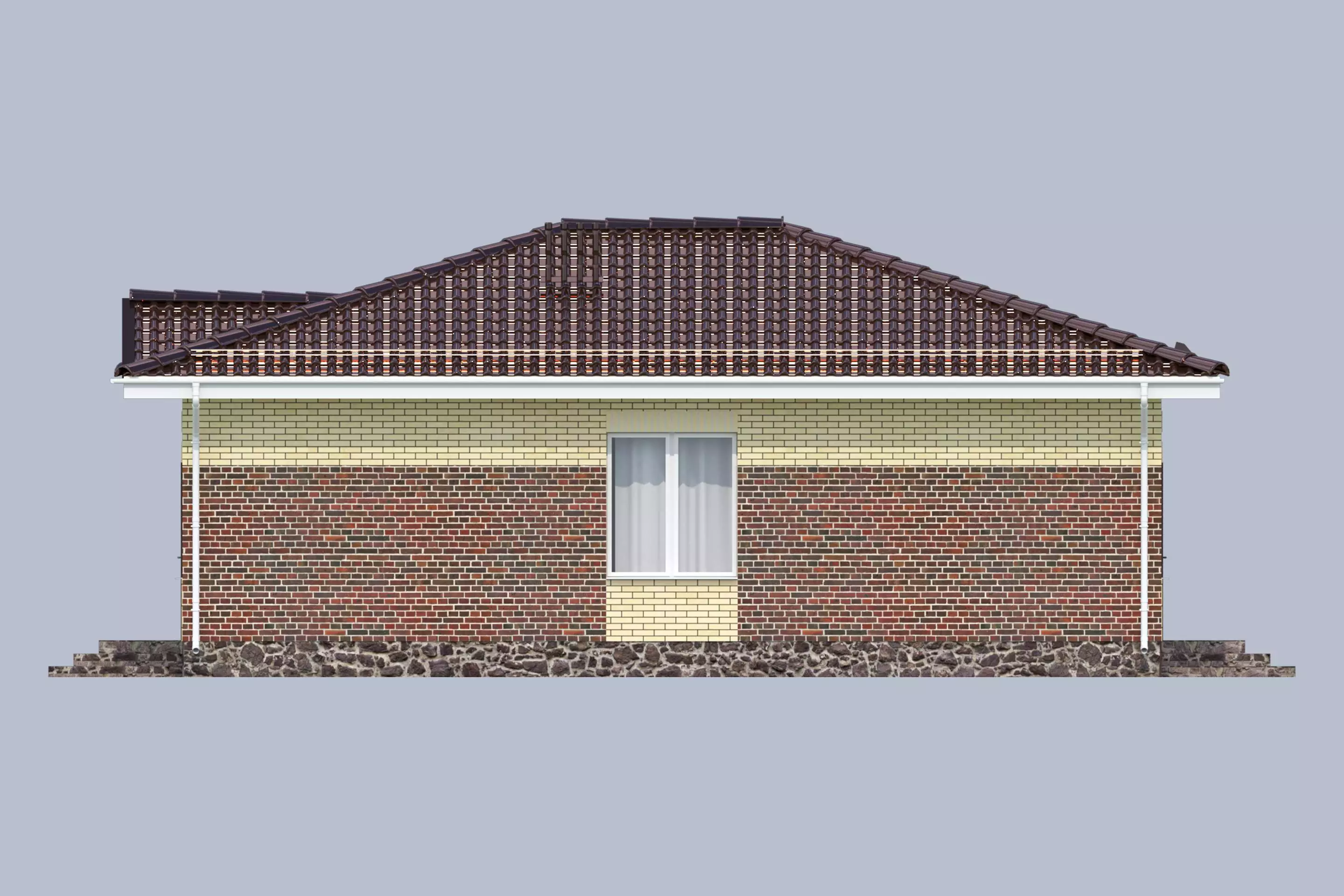 «Паоло» - проект одноэтажного площадью 96 м² с вальмовой кровлей. Облицовка кирпичом обеспечивает дополнительную защиту от внешних воздействий и улучшает теплоизоляционные свойства конструкции.