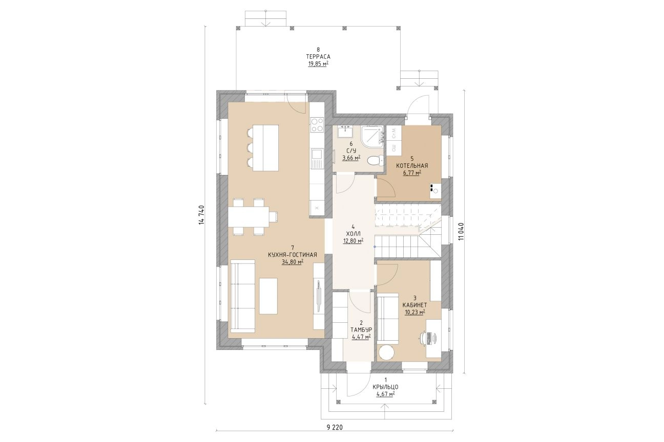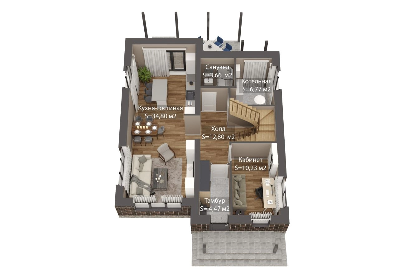 Планировка дома очень удобна и функциональна. Основной зоной первого этажа выступает просторная кухня-гостиная с выходом на большую террасу. В доме располагаются четыре комнаты, одна из которых – мастер-спальня с отдельным санузлом и вместительной гардеробной. Комнату на первом этаже можно оборудовать под рабочий кабинет.