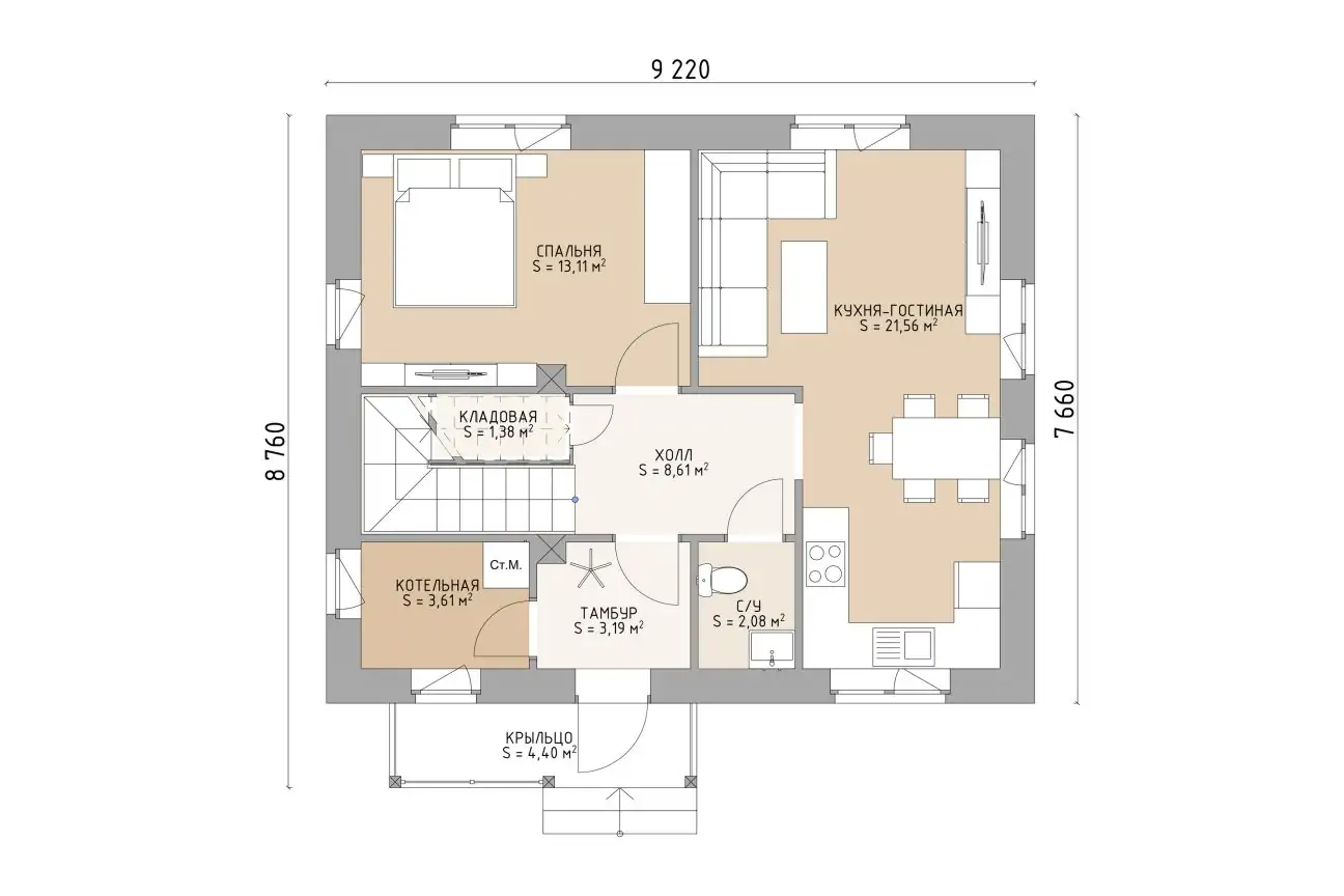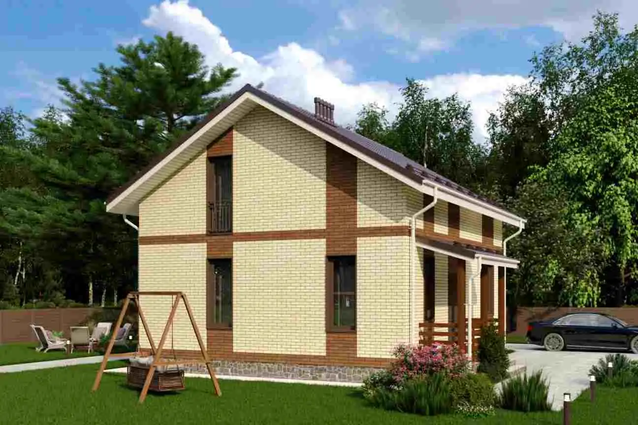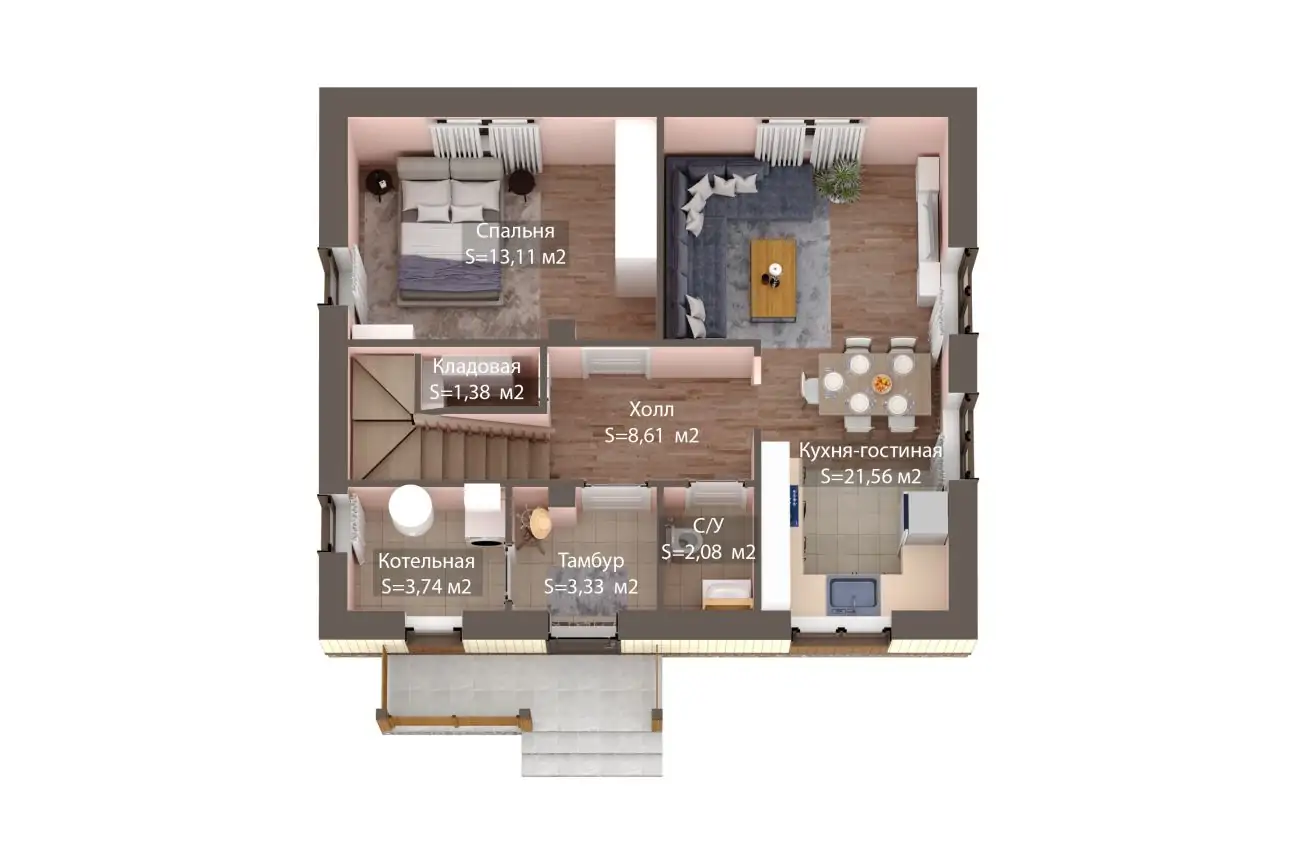 На первом этаже расположилась просторная кухня-гостиная, гостевая комната, технические помещения и санузел. На мансардном этаже вместились три спальни и ванная комната. При необходимости спальню можно переоборудовать в кабинет или игровую комнату.