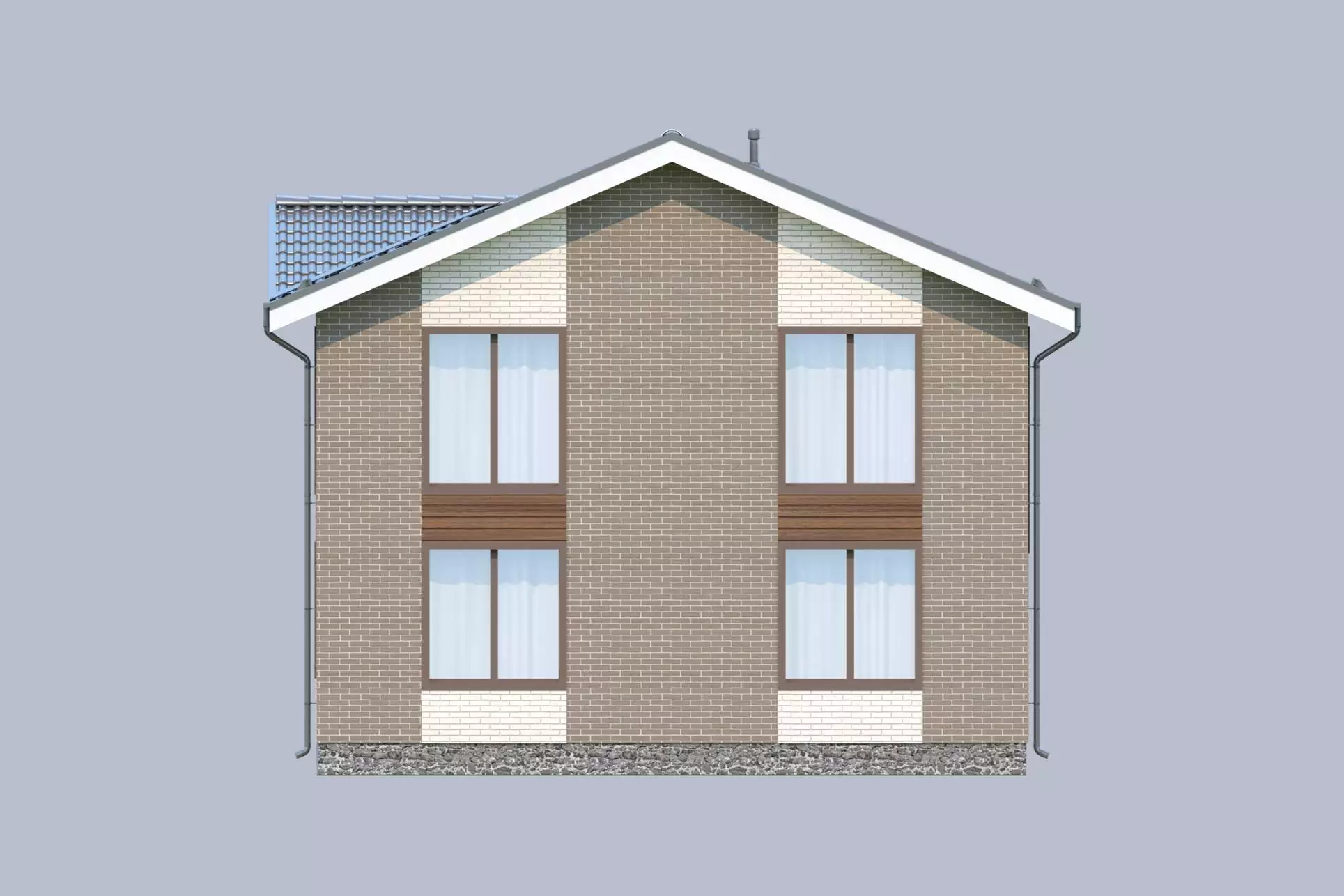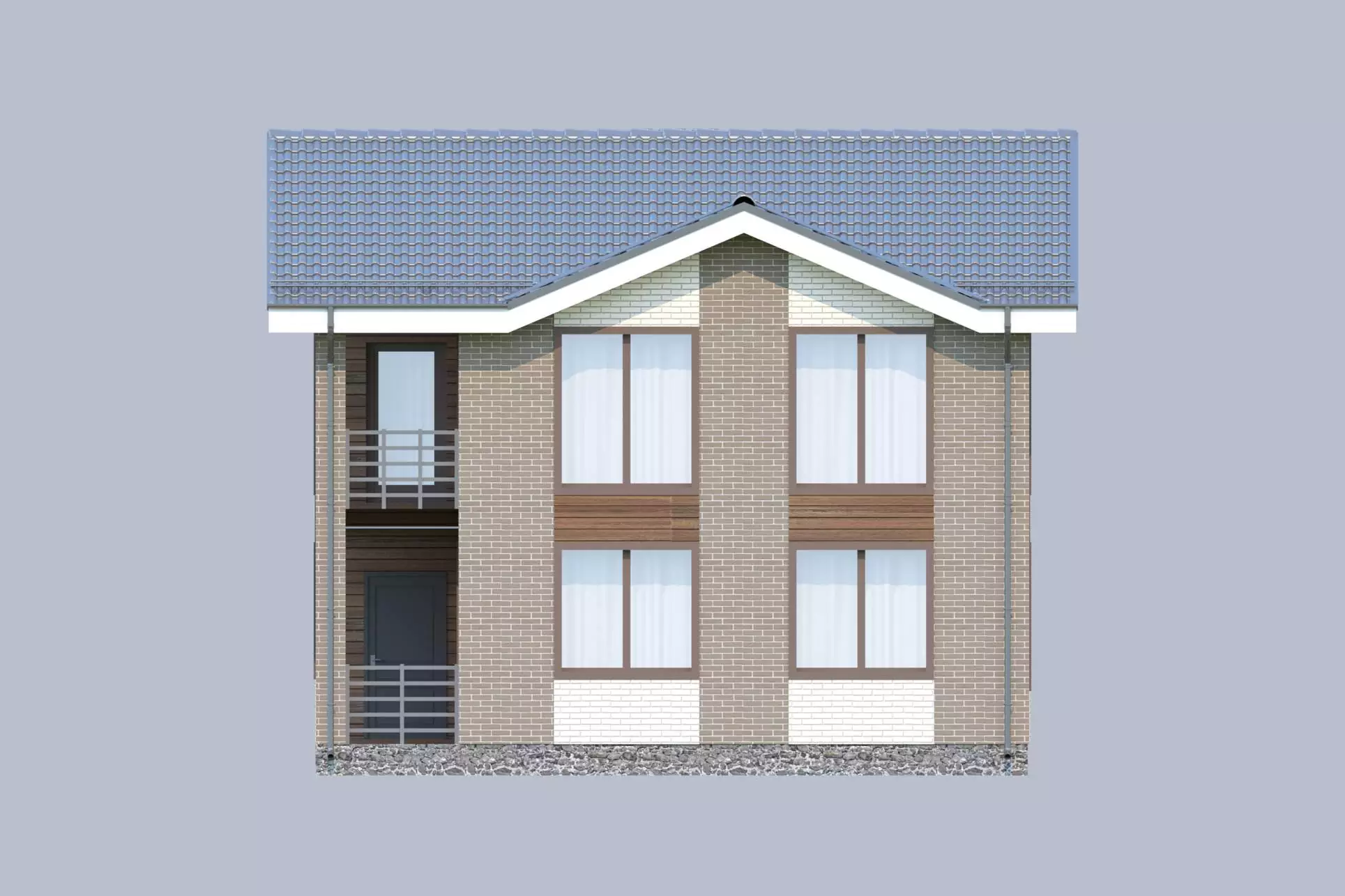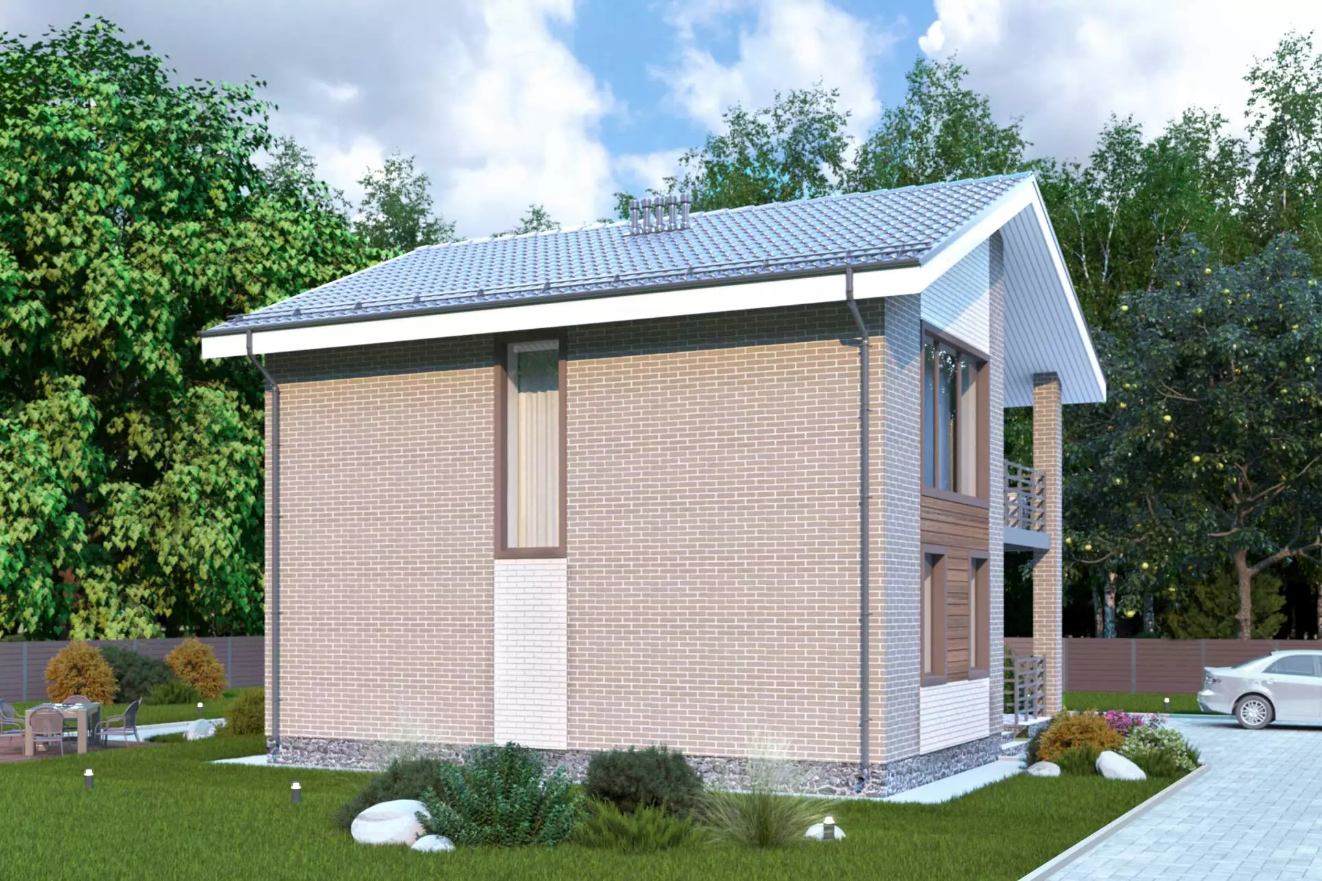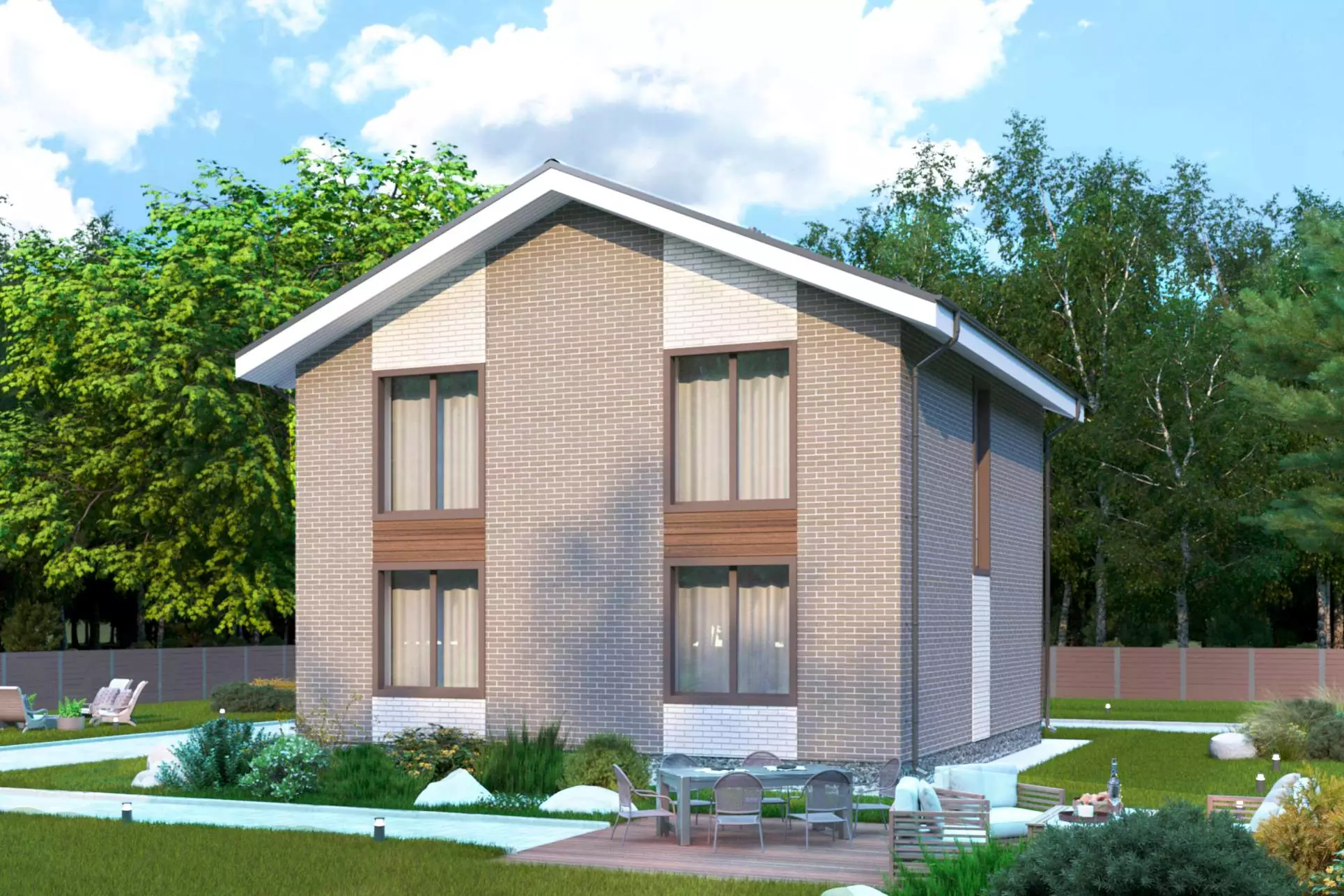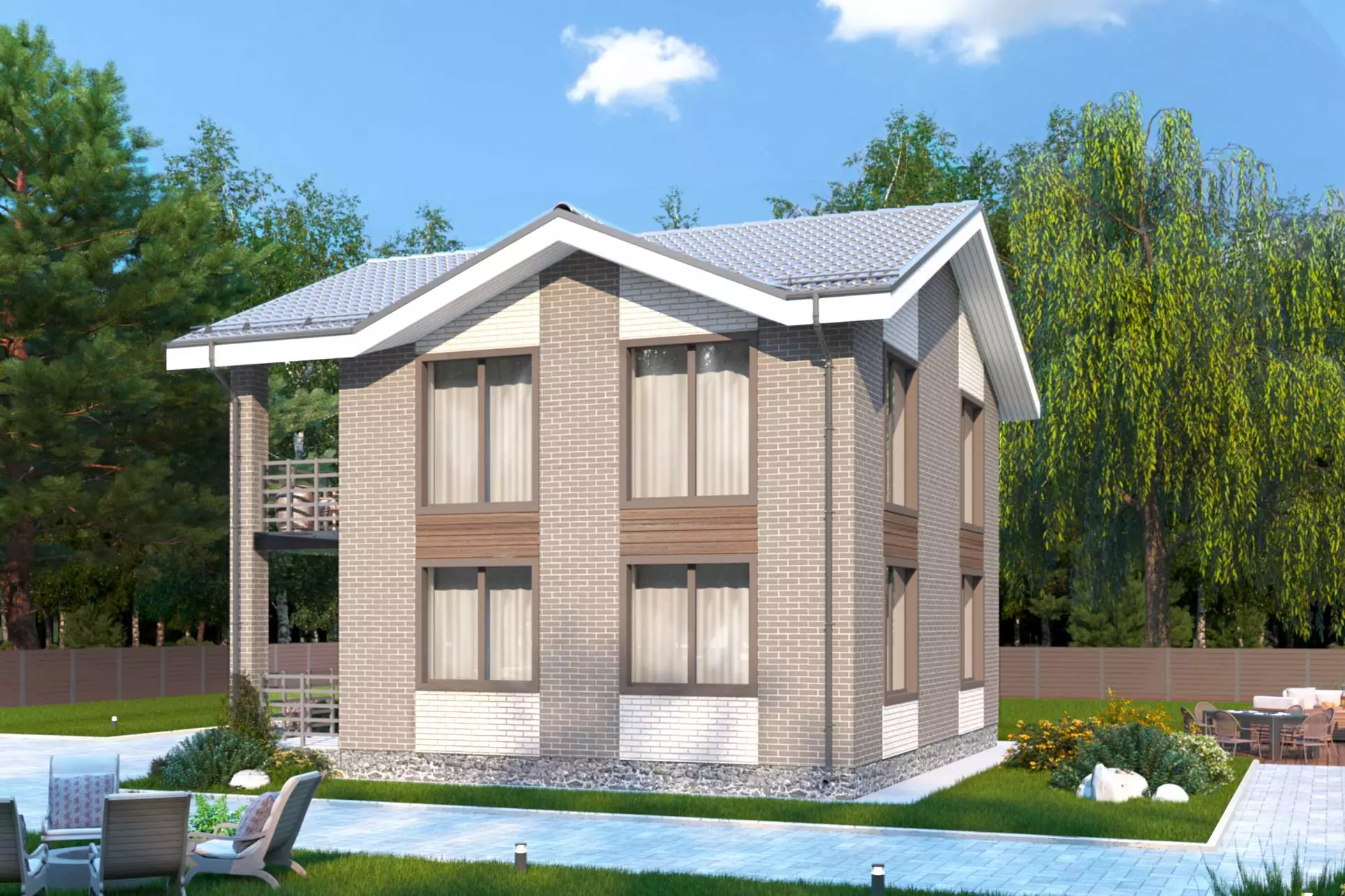 Особенностью экстерьера проекта «Ренато» является комбинирование разнофактурных отделочных материалов - облицовочного кирпича и планкена. Главный фасад здания украшает открытый балкон, который органично вписывается в общую композицию с крыльцом, создавая ощущение единого пространства.