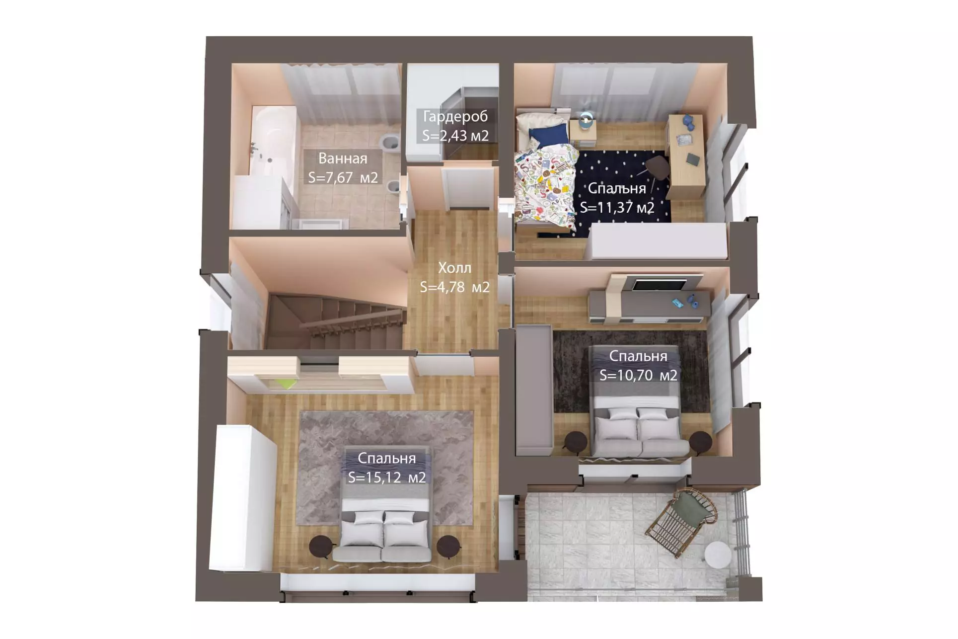 Второй этаж отведён под жилую зону. Он вместил в себя три спальни, ванную комнату и гардеробную. Одна из комнат имеет собственный выход на балкон, что добавляет ей дополнительное удобство и привлекательность.