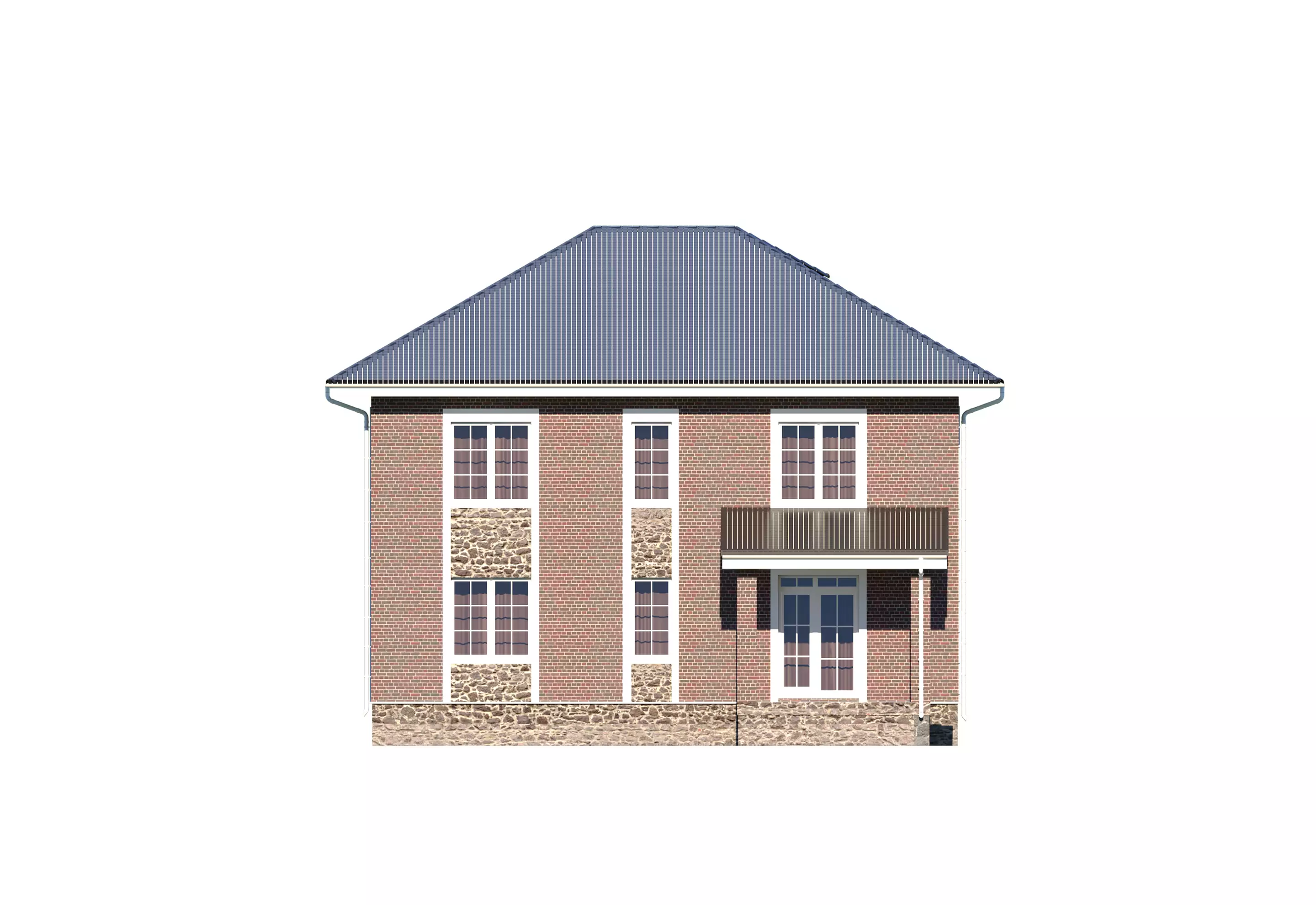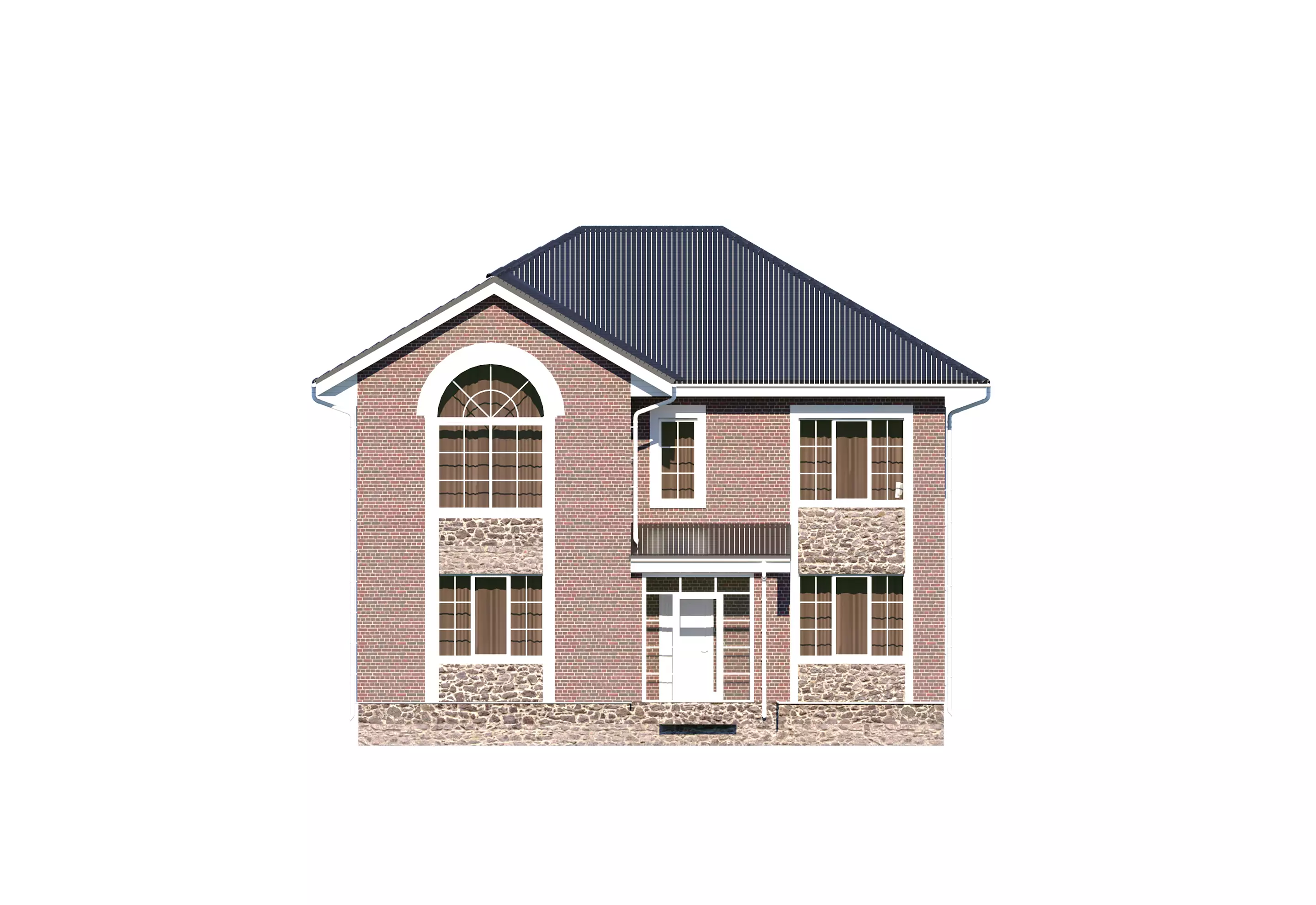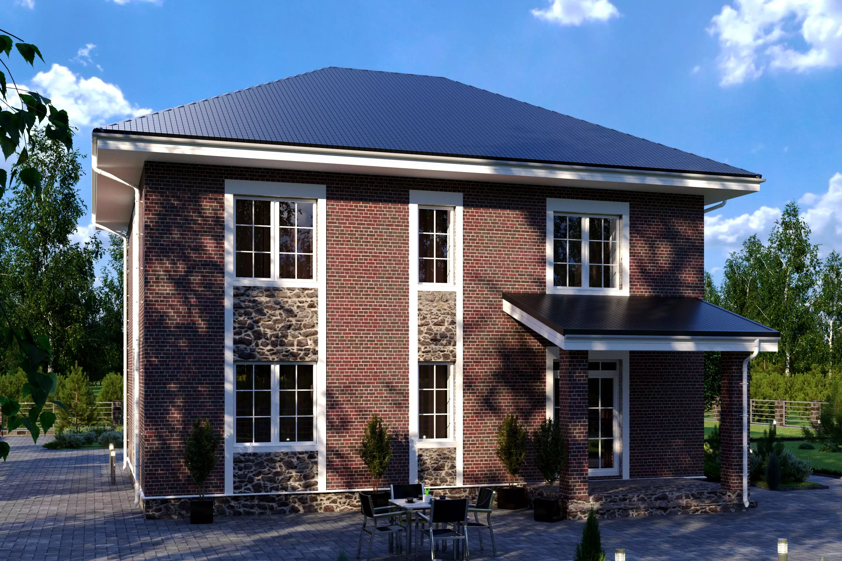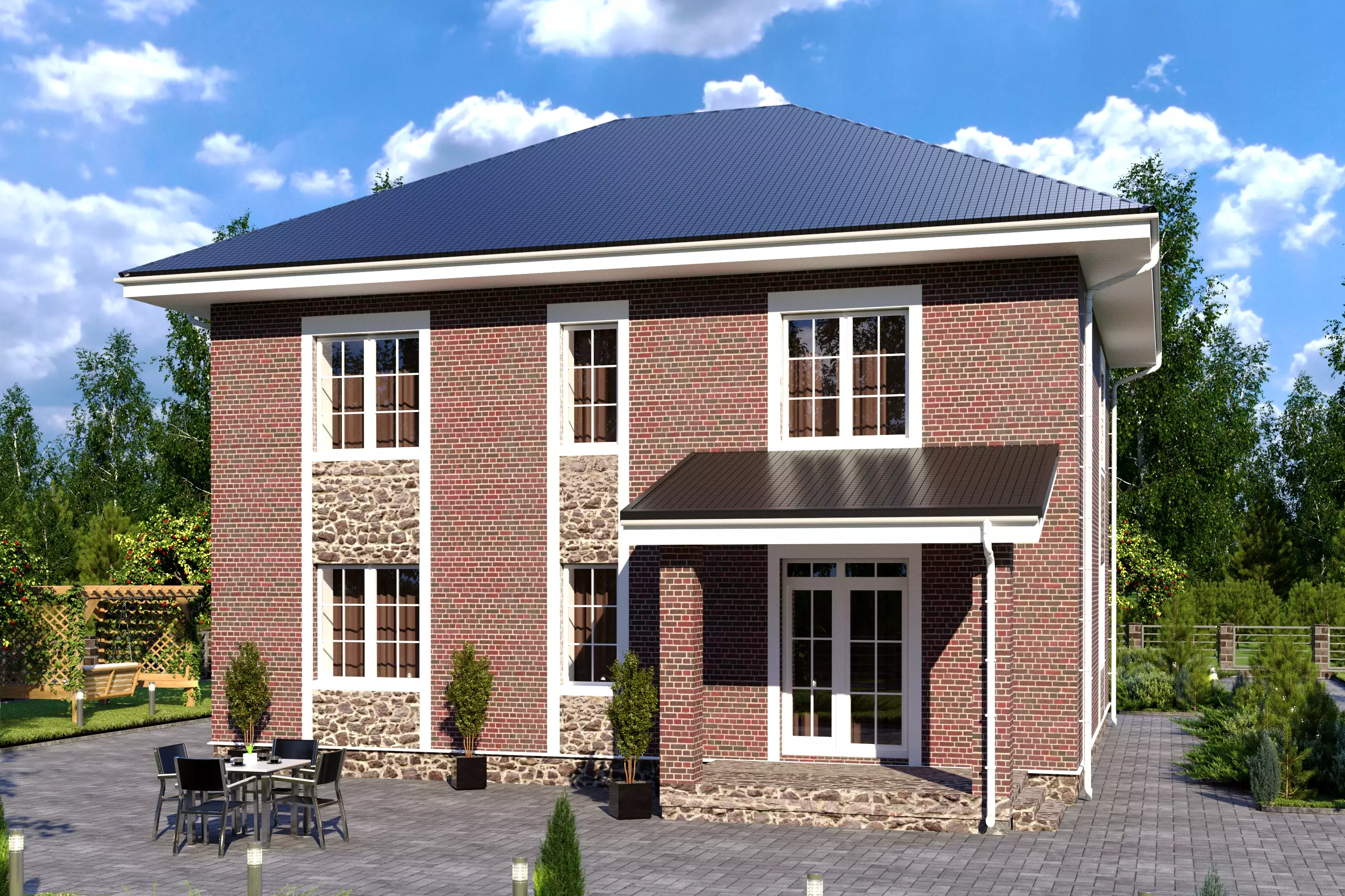 "Сантино" – большой двухэтажный дом, выполненный в классическом стиле. Выразительной чертой экстерьера стало сочетание декоративного камня и кирпича в облицовке дома. Интересные решения по остеклению добавляют внешнему виду «Сантино» особый шарм. Это шпросы на окнах, остекленное крыльцо и, конечно, брамантово окно главного фасада.