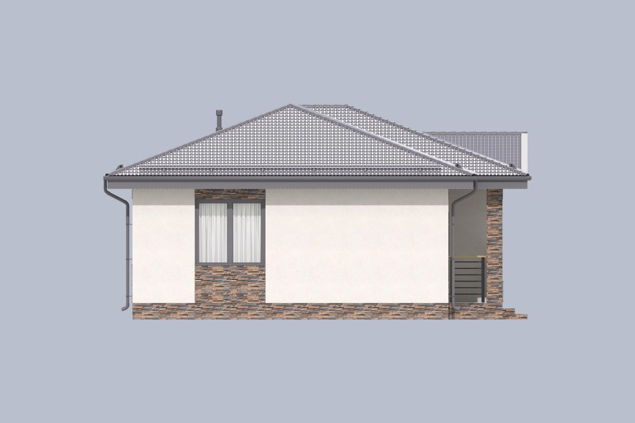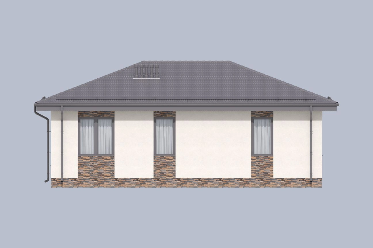 Планировка дома разделена на три зоны. Центральная часть является проходной и технической, где отведено место для вместительной кладовой, которую можно заменить гардеробной. Правая часть дома является общественной, где расположилась просторная кухня-гостиная с полноценным столовым местом. Слева – приватная зона с двумя спальными комнатами.