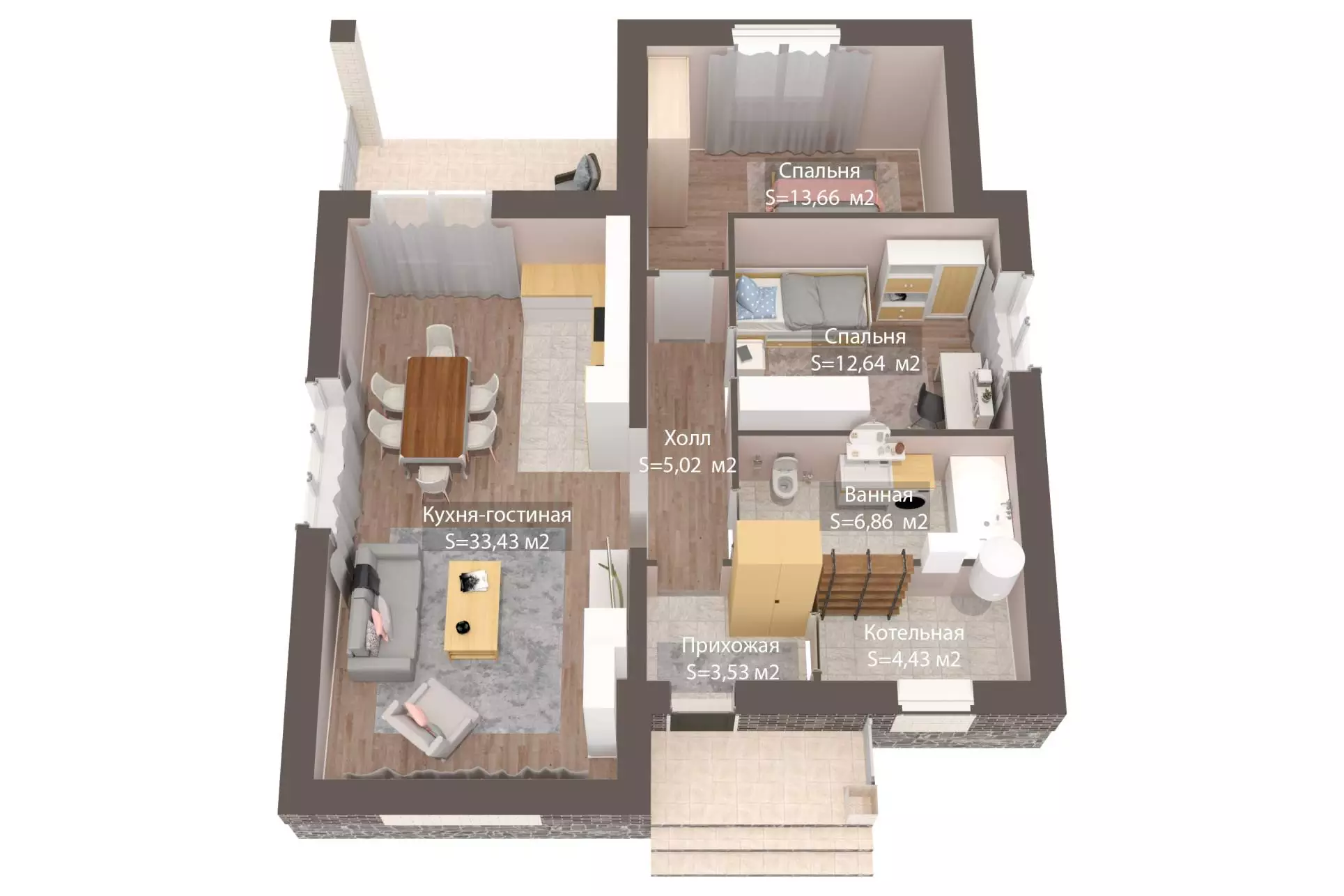 Также дом на своей площади вместил две спальни, совмещённый санузел и котельную.