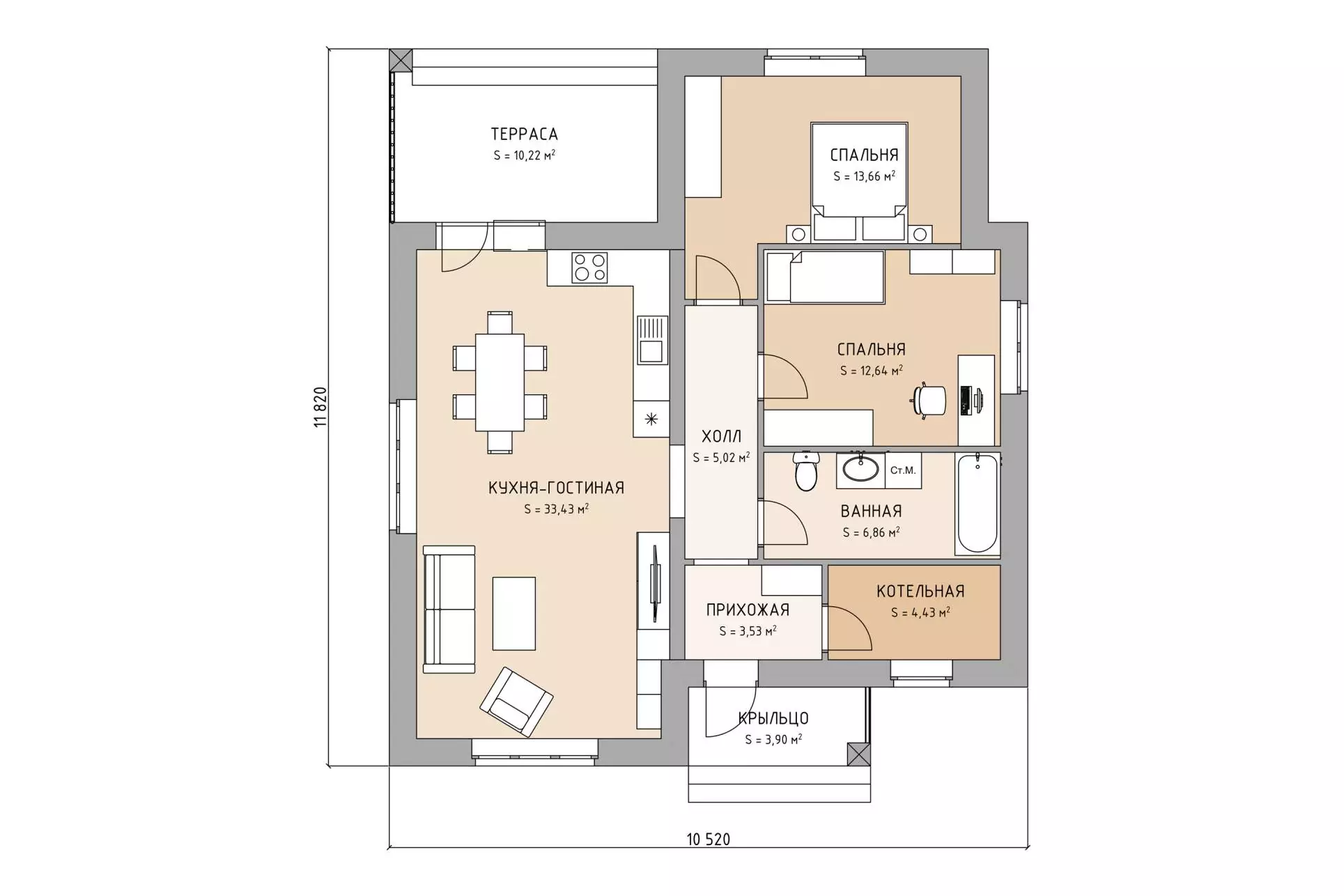 В проекте «Бруно» сочетаются компактность и уют. Особенностью дома является большая кухня-гостиная с выходом на собственную террасу. Это отличное место для приятного времяпрепровождения с семьёй и друзьями.