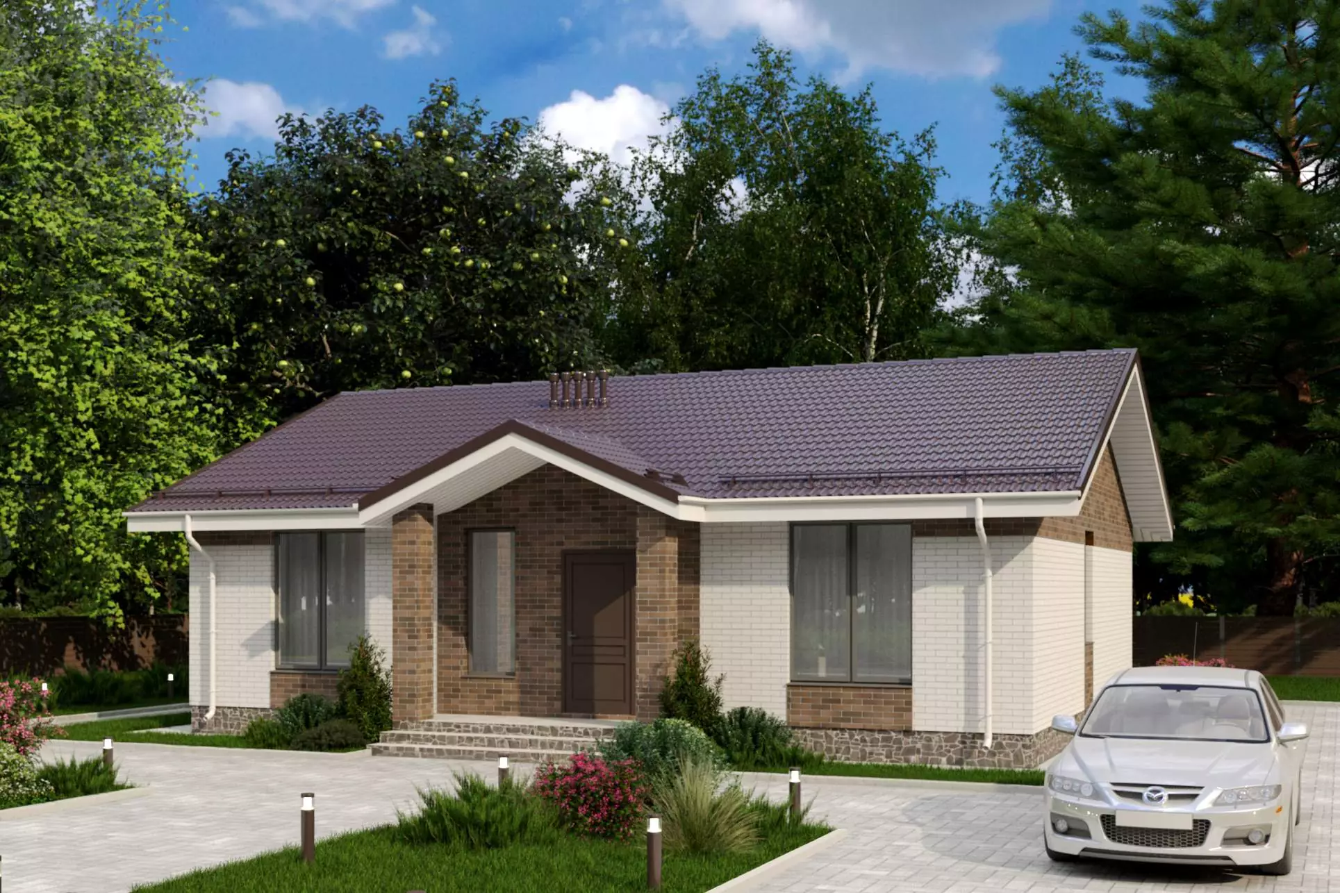 Внешний облик дома притягивает своей лаконичностью. Выразительность экстерьеру придают крылечная и террасная зона, которые выделяются конструктивом крыш. Интересными сочетаниями облицовочного кирпича можно создавать контрастные акценты или плавные переходы в цветовой гамме фасадов дома.