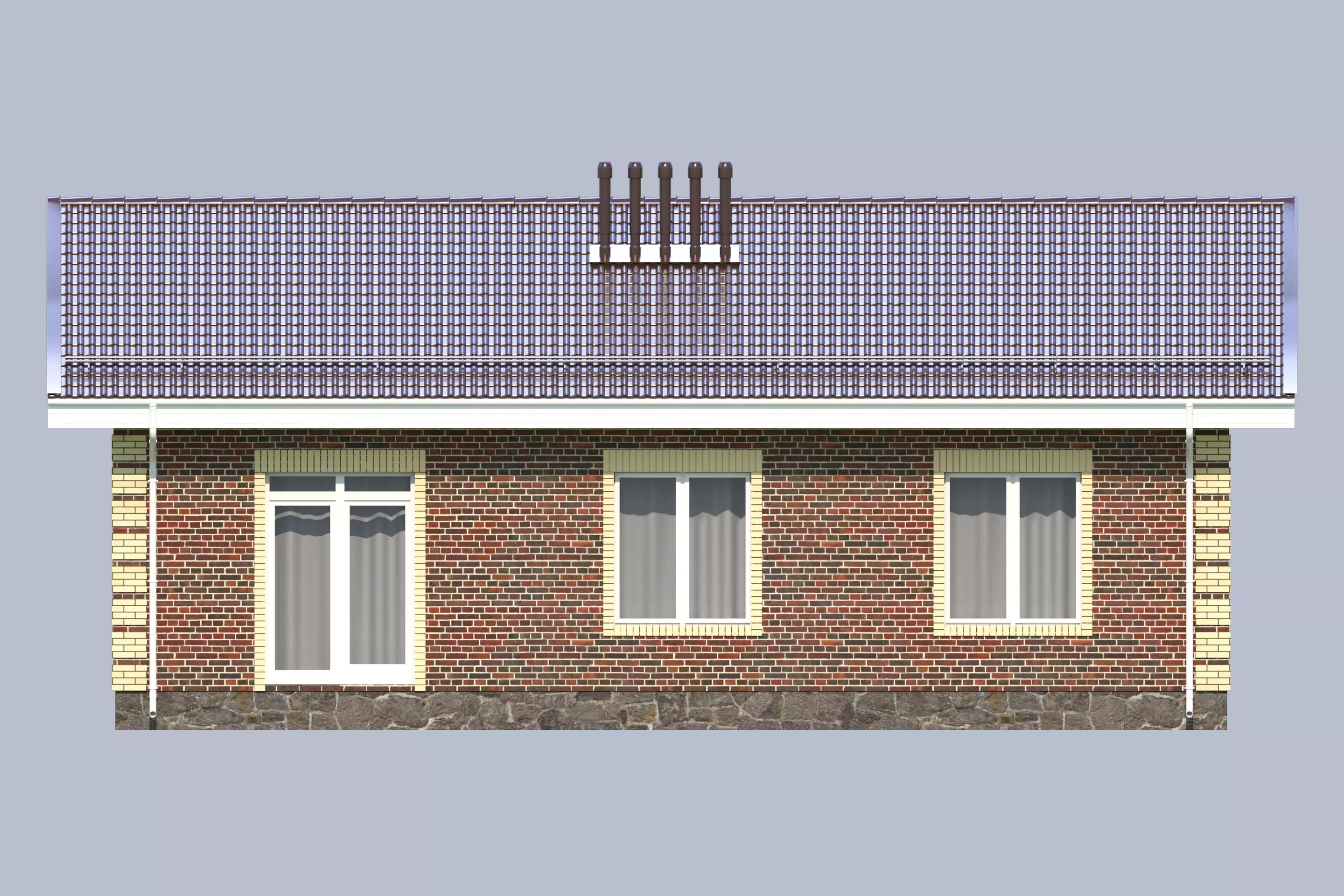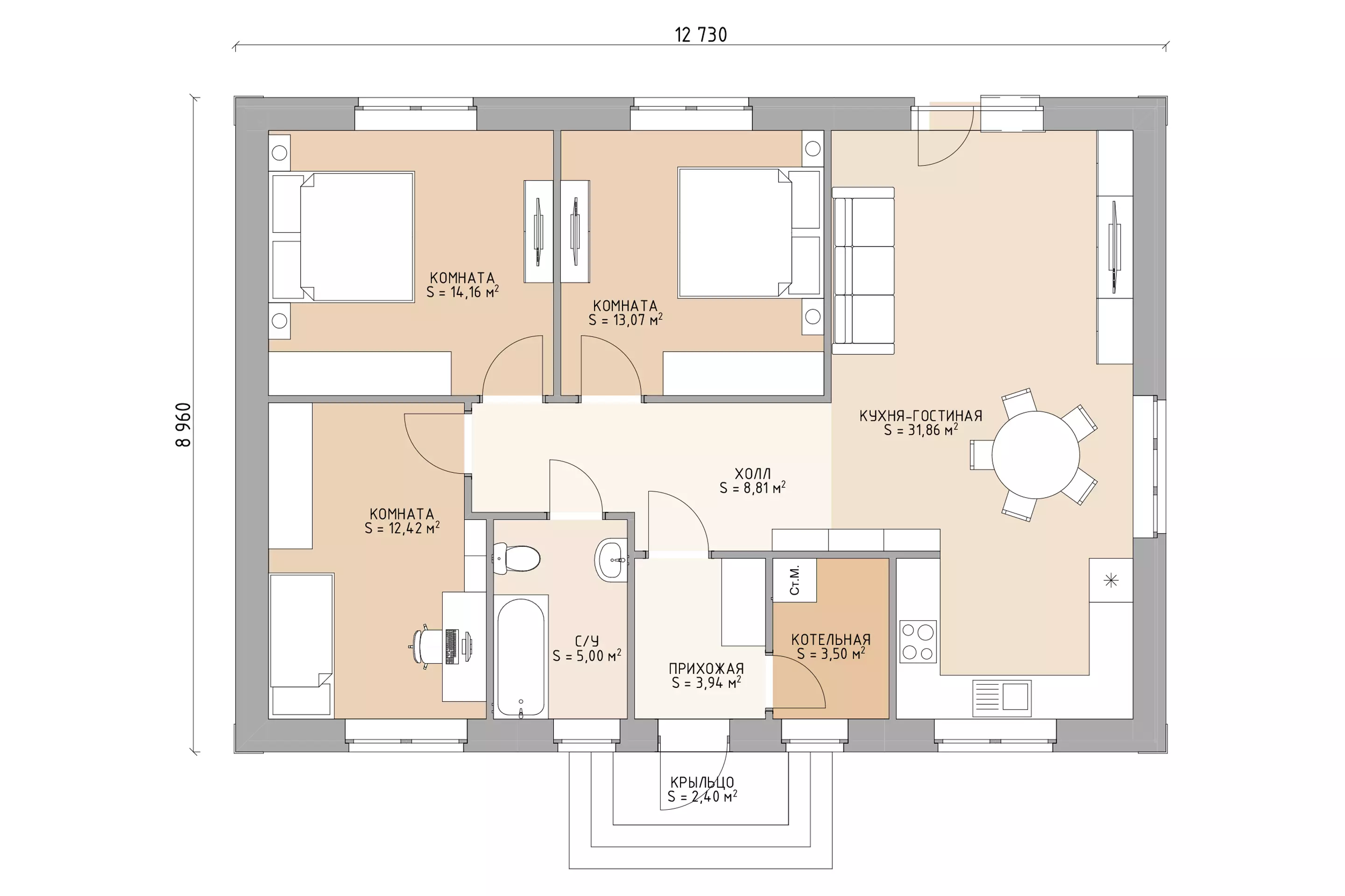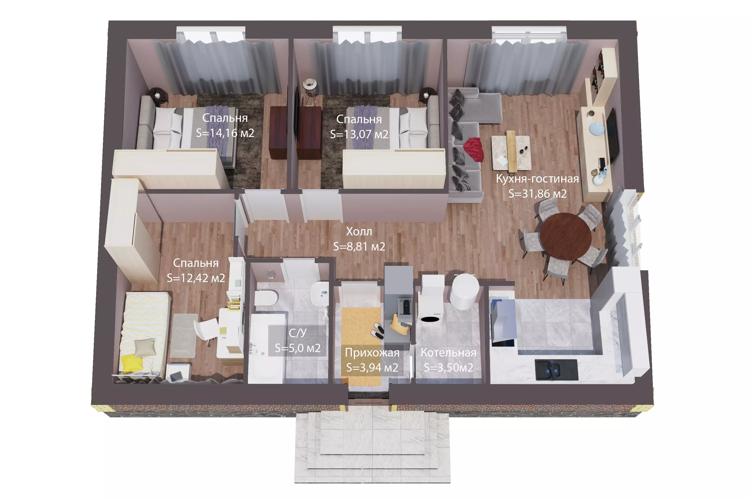 Центром притяжения служит просторная кухня-гостиная площадью 32 м², из которой предусмотрен выход во внутренний дворик. В доме расположены три спальни, санузел, котельная и вместительный холл, объединяющий все внутренние помещения.
