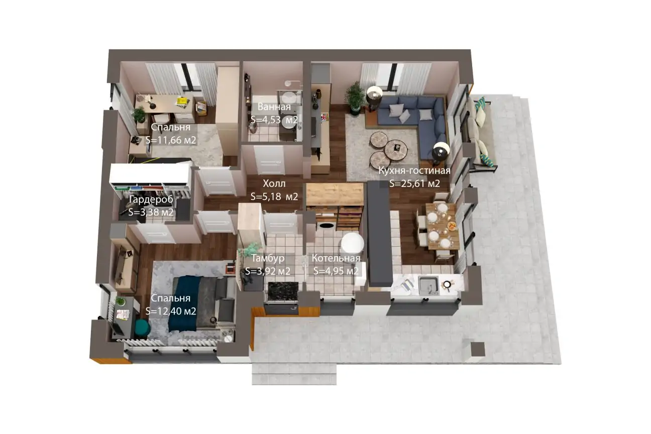 В доме также имеются две уютные спальные комнаты для отдыха всех членов семьи. Оставшееся пространство делят между собой помещения бытового характера: санузел, тамбур и котельная.