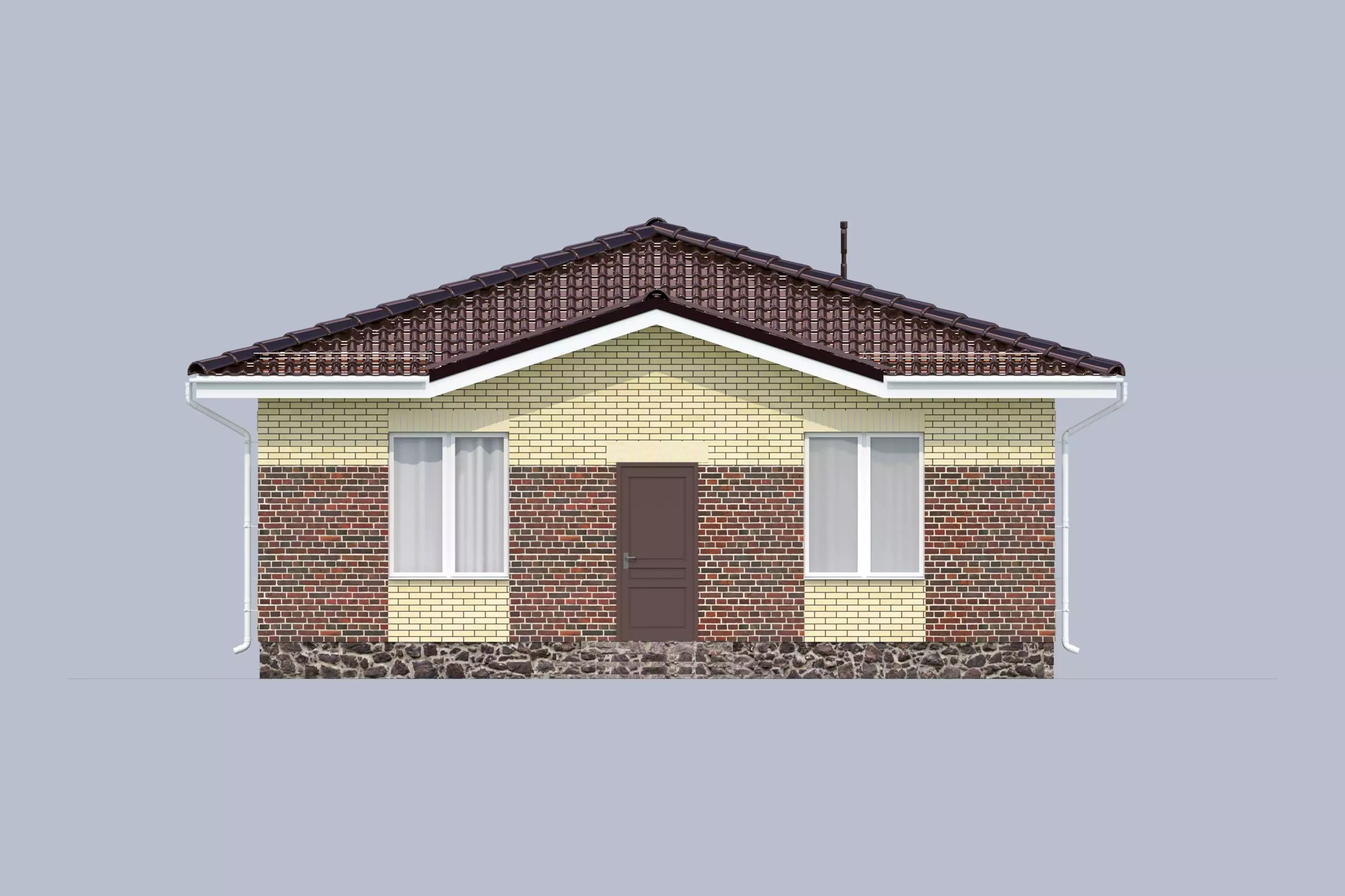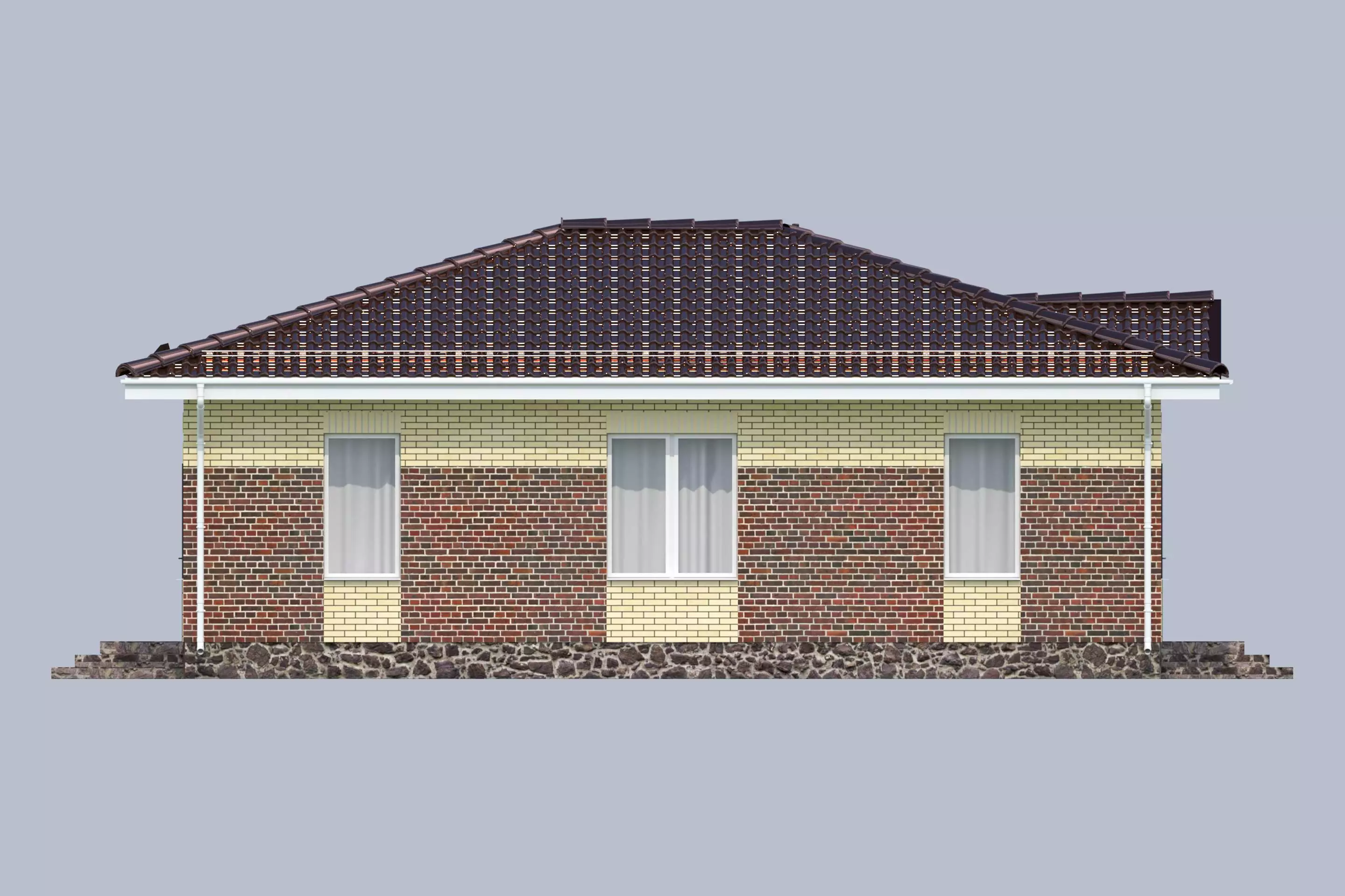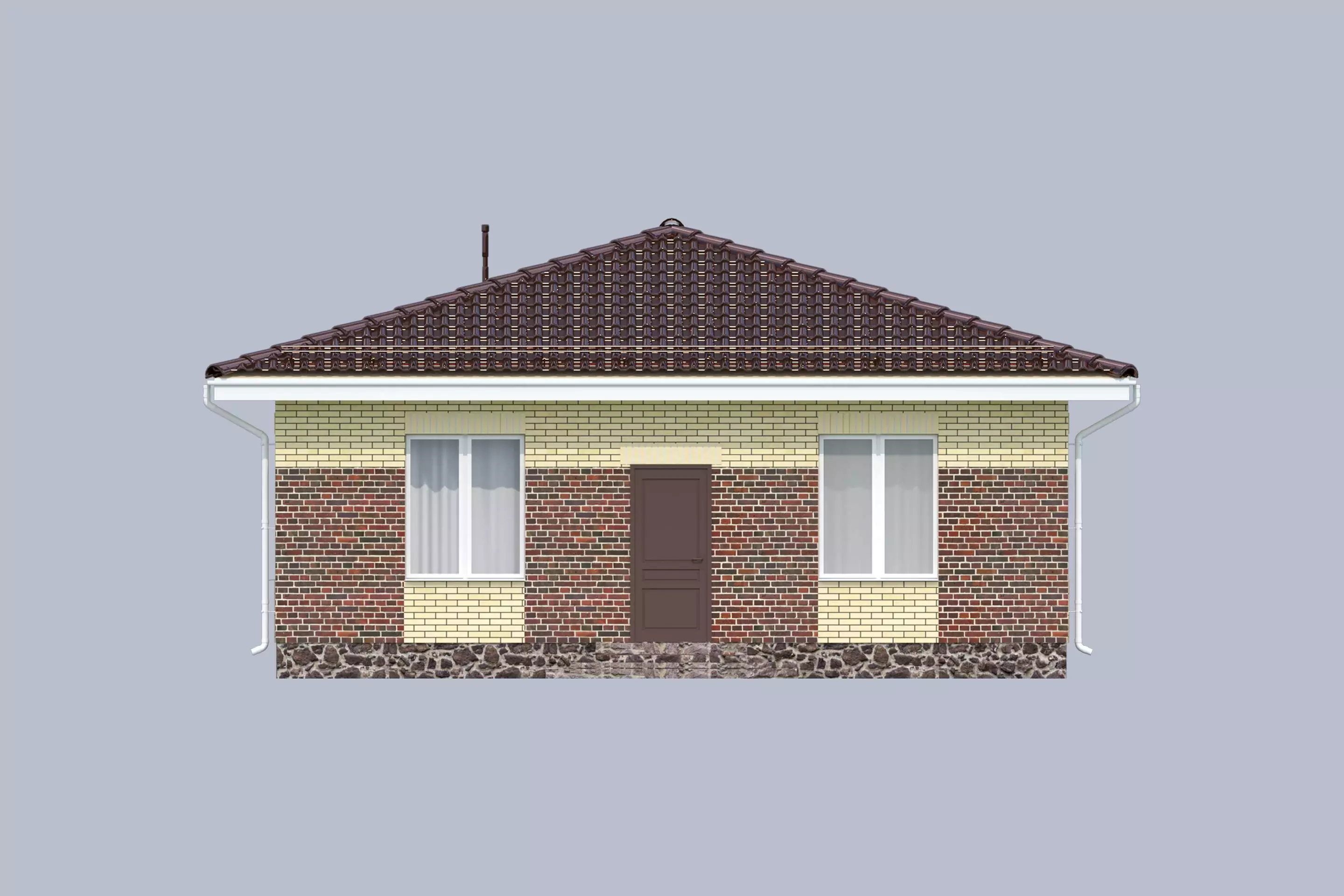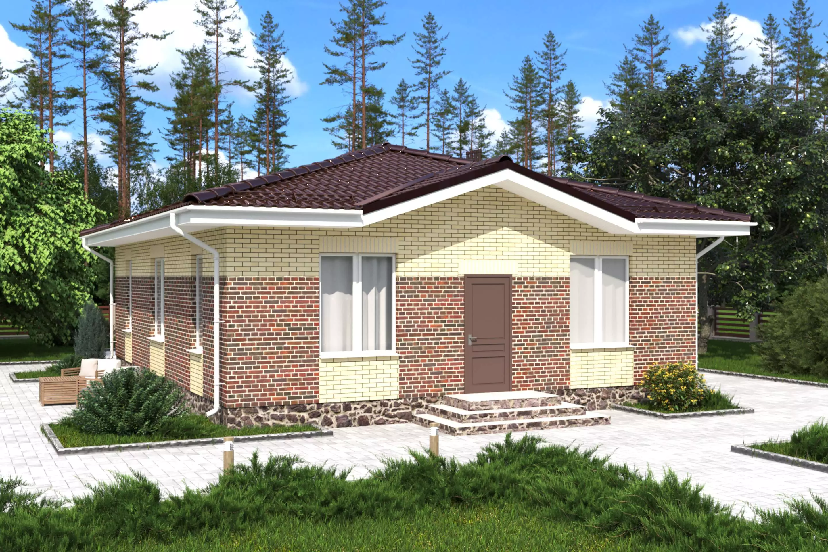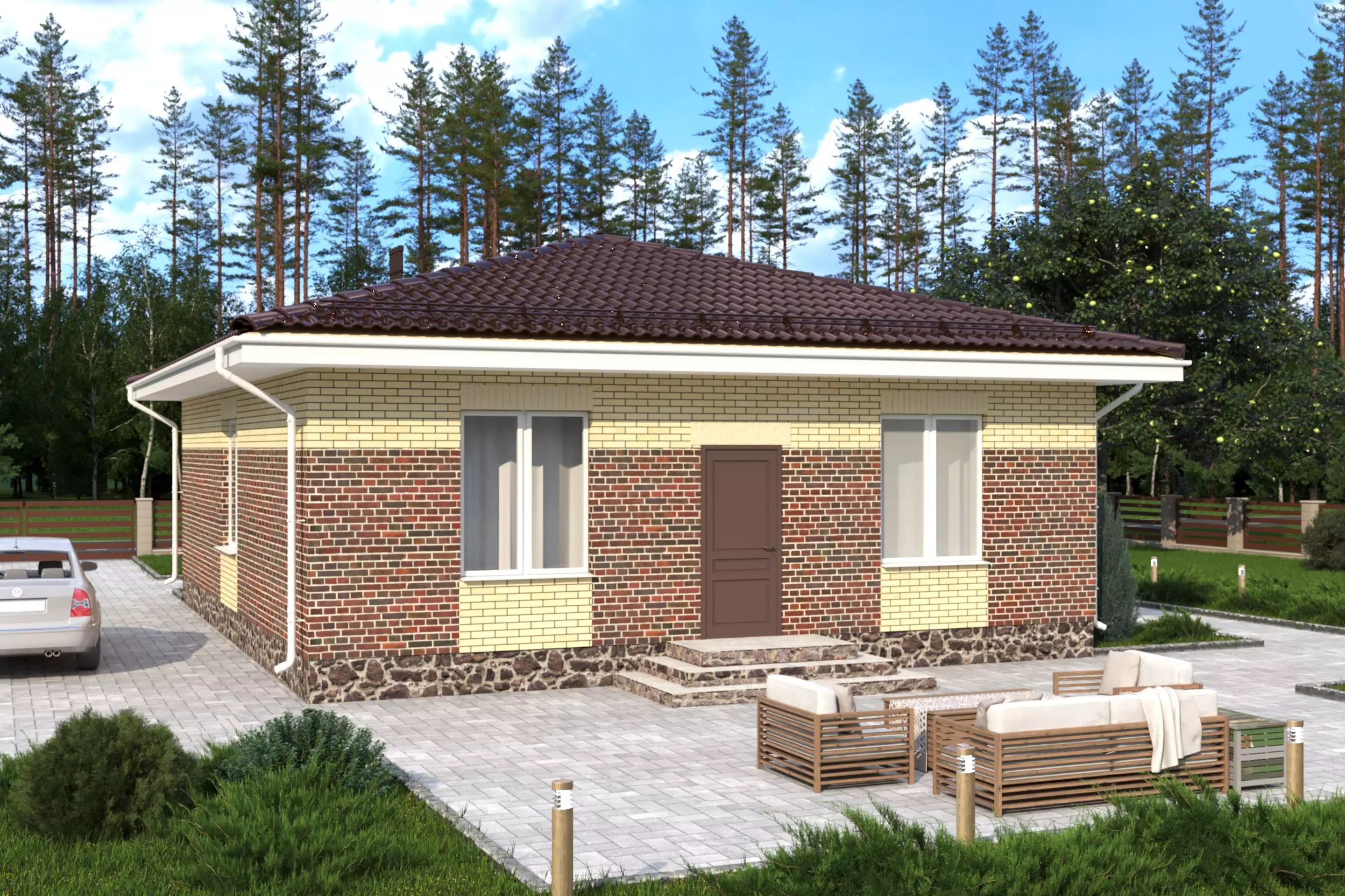 «Паоло» - проект одноэтажного площадью 96 м² с вальмовой кровлей. Облицовка кирпичом обеспечивает дополнительную защиту от внешних воздействий и улучшает теплоизоляционные свойства конструкции.