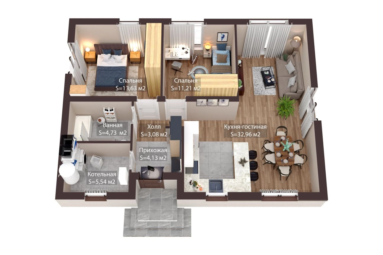 Внутренняя планировка проста и функциональна. В очень просторной и светлой кухне-гостиной можно разместиться большой компанией друзей. Из гостиной запланирован выход в собственный сад. Также в доме расположены две уютные спальни, ванная комната и котельная.